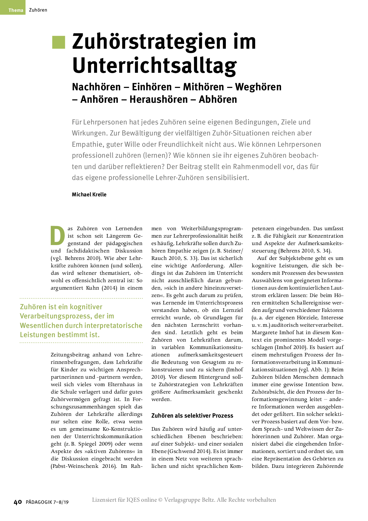 Für Lehrpersonen hat jedes Zuhören seine eigenen Bedingungen, Ziele und Wirkungen. Zur Bewältigung der vielfältigen Zuhör-Situationen reichen aber Empathie, guter Wille oder Freundlichkeit nicht aus. Wie können Lehrpersonen professionell zuhören (lernen)? Wie können sie ihr eigenes Zuhören beobachten und darüber reflektieren? Der Beitrag stellt ein Rahmenmodell vor, das für das eigene professionelle Lehrer-Zuhören sensibilisiert.