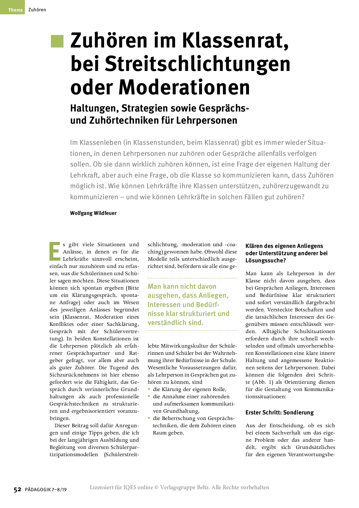 Im Klassenleben (in Klassenstunden, beim Klassenrat) gibt es immer wieder Situationen, in denen Lehrpersonen nur zuhören oder Gespräche allenfalls verfolgen sollen. Ob sie dann wirklich zuhören können, ist eine Frage der eigenen Haltung der Lehrkraft, aber auch eine Frage, ob die Klasse so kommunizieren kann, dass Zuhören möglich ist. Wie können Lehrkräfte ihre Klassen unterstützen, zuhörerzugewandt zu kommunizieren – und wie können Lehrkräfte in solchen Fällen gut zuhören?