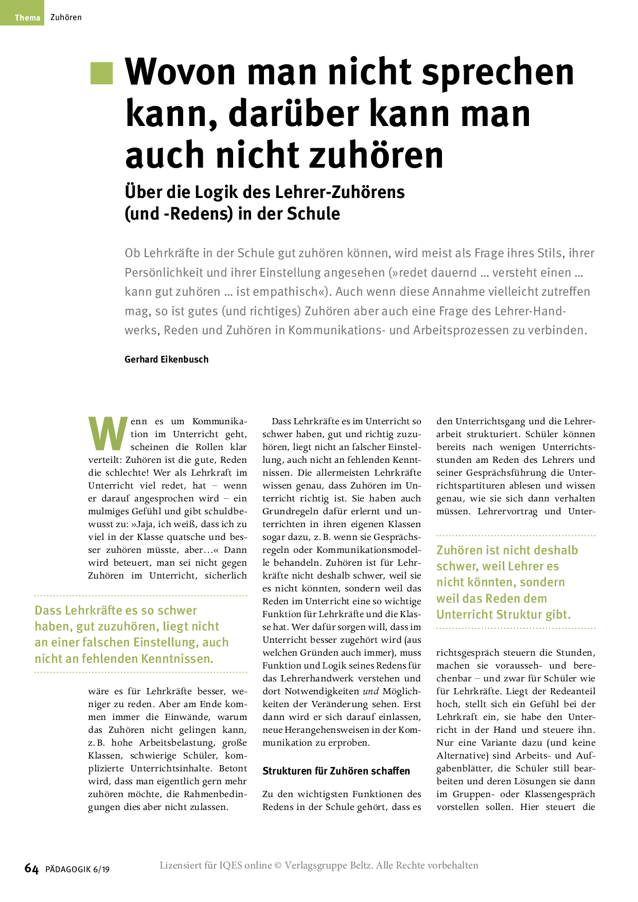 Ob Lehrkräfte in der Schule gut zuhören können, wird meist als Frage ihres Stils, ihrer Persönlichkeit und ihrer Einstellung angesehen (»redet dauernd … versteht einen … kann gut zuhören … ist empathisch«). Auch wenn diese Annahme vielleicht zutreffen mag, so ist gutes (und richtiges) Zuhören aber auch eine Frage des Lehrer-Handwerks, Reden und Zuhören in Kommunikations- und Arbeitsprozessen zu verbinden.