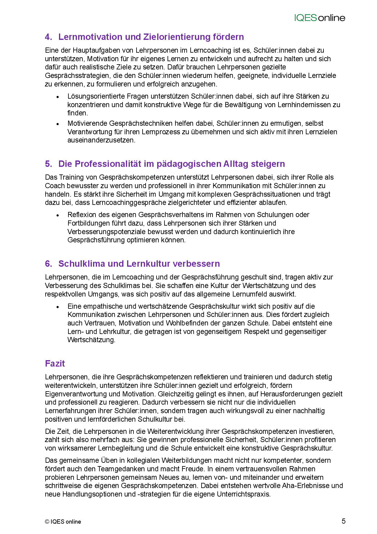 Die Zeit, die Lehrpersonen in die Weiter­entwicklung ihrer Gesprächs­kompetenzen investieren, zahlt sich mehrfach aus: Sie gewinnen professionelle Sicherheit, ihre Schülerinnen und Schüler profitieren von besserer Lernbegleitung und die Schule entwickelt eine konstruktive Gesprächskultur. In den praxisnahen Übungen entstehen wertvolle Aha-Erlebnisse und neue Handlungsoptionen für den Schulalltag. Die positiven Effekte wirken weit über die einzelnen Coaching-Gespräche hinaus und tragen zu einer lernförderlichen Schulkultur bei.