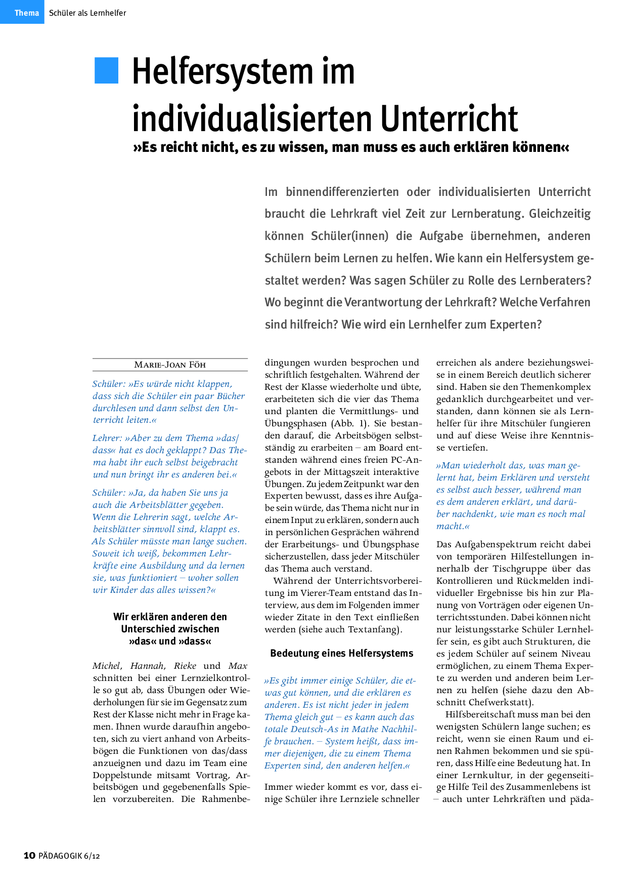 Im binnendifferenzierten oder individualisierten Unterricht braucht die Lehrkraft viel Zeit zur Lernberatung. Gleichzeitig können Schüler(innen) die Aufgabe übernehmen, anderen Schülern beim Lernen zu helfen. Wie kann ein Helfersystem gestaltet werden? Was sagen Schüler zu Rolle des Lernberaters? Wo beginnt die Verantwortung der Lehrkraft? Welche Verfahren sind hilfreich? Wie wird ein Lernhelfer zum Experten?
