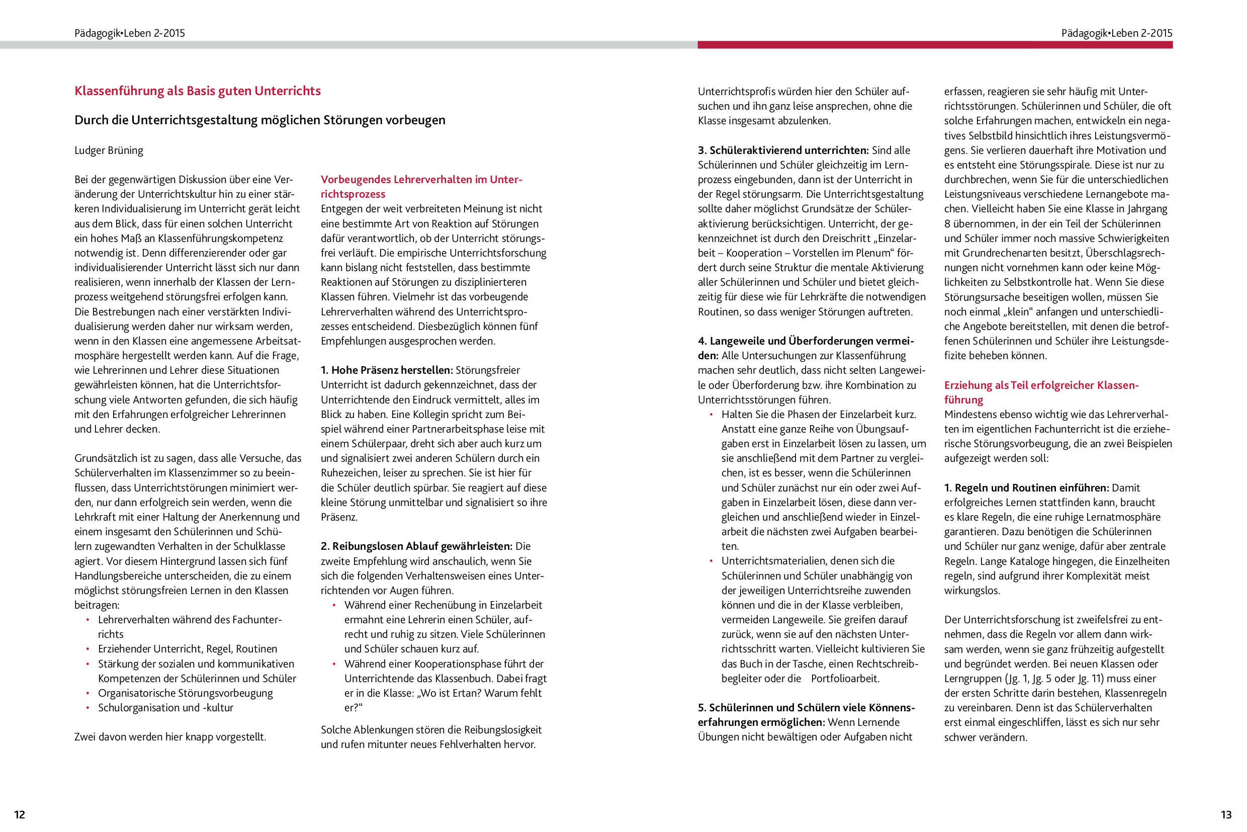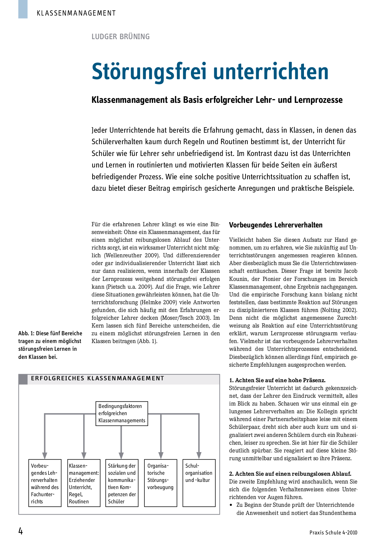 Auf den ersten Blick werden Unterrichtsstörungen häufig als Fehlverhalten der Heranwachsenden interpretiert: Sie agieren nicht so, dass die Lehrkraft ihr Unterrichtsangebot ungestört realisieren kann. Diese aus Lehrersicht verständliche Interpretation von Unterrichtsstörungen verhindert, dass man über die Unterrichtsgestaltung als Ursache für Unterrichtsstörungen nachdenkt. Hier müssen insbesondere mögliche Über- oder Unterforderungen in den Blick genommen werden.Ludger Brüning / Tobias Saum