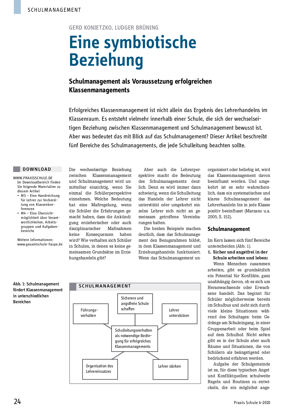 Dieser Fachartikel beschreibt fünf Bereiche des Schulmanagements, die jede Schulleitung beachten sollte. Es geht darum, die symbiotische Beziehung zwischen Klassen- und Schulmanagement aufzuzeigen.