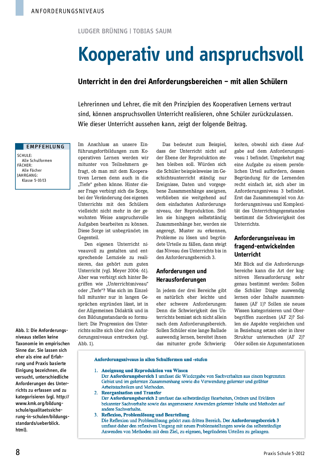 In diesem Fachartikel geht es darum, den eigenen Unterricht niveauvoll zu gestalten und entsprechende Lernziele zu realisieren, während man gleichzeitig mit den Prinzipien des Kooperativen Lernens arbeitet.