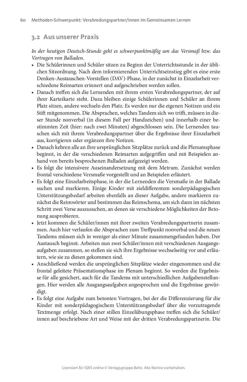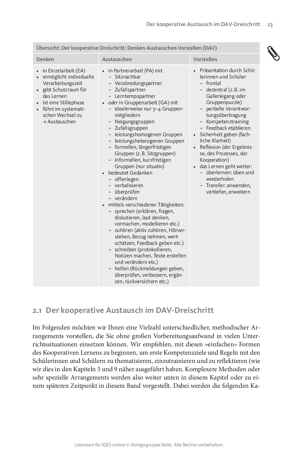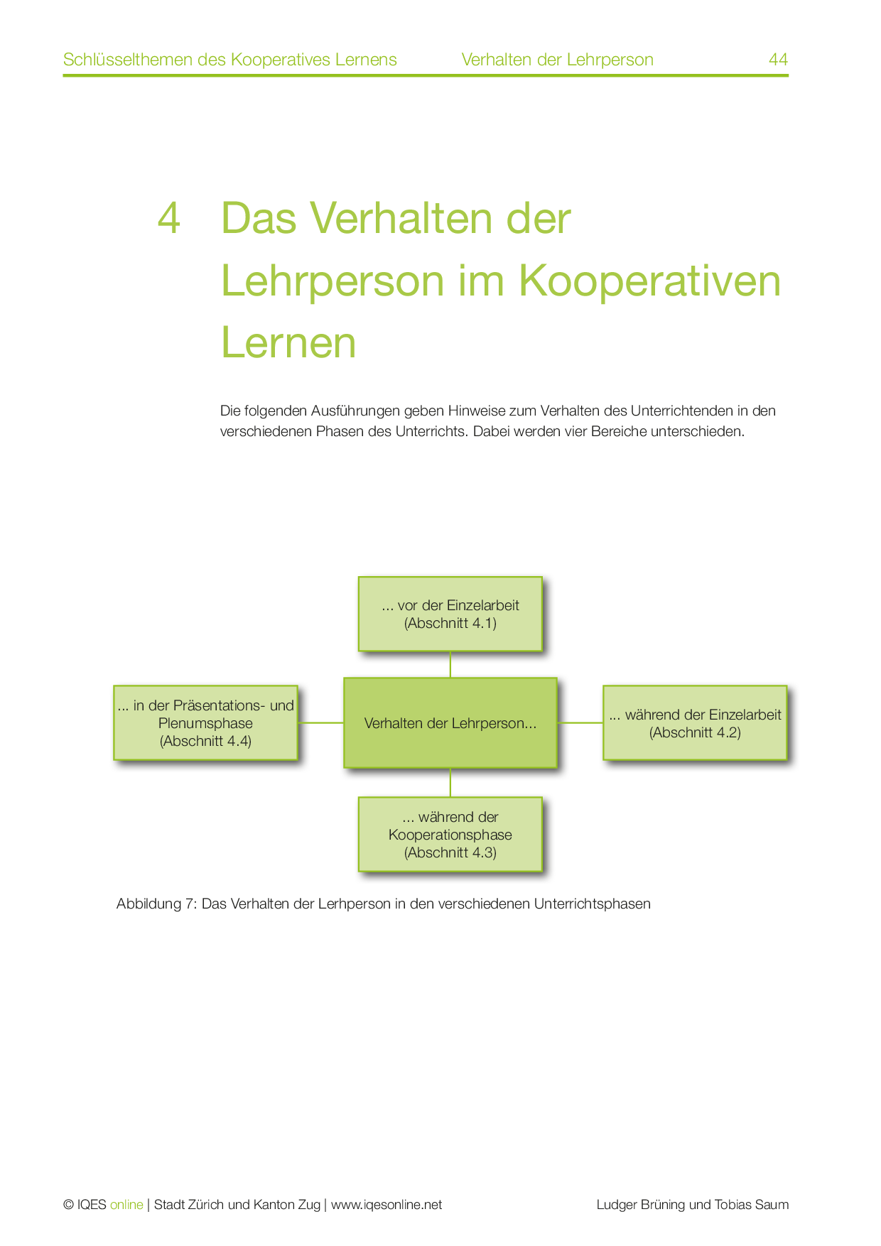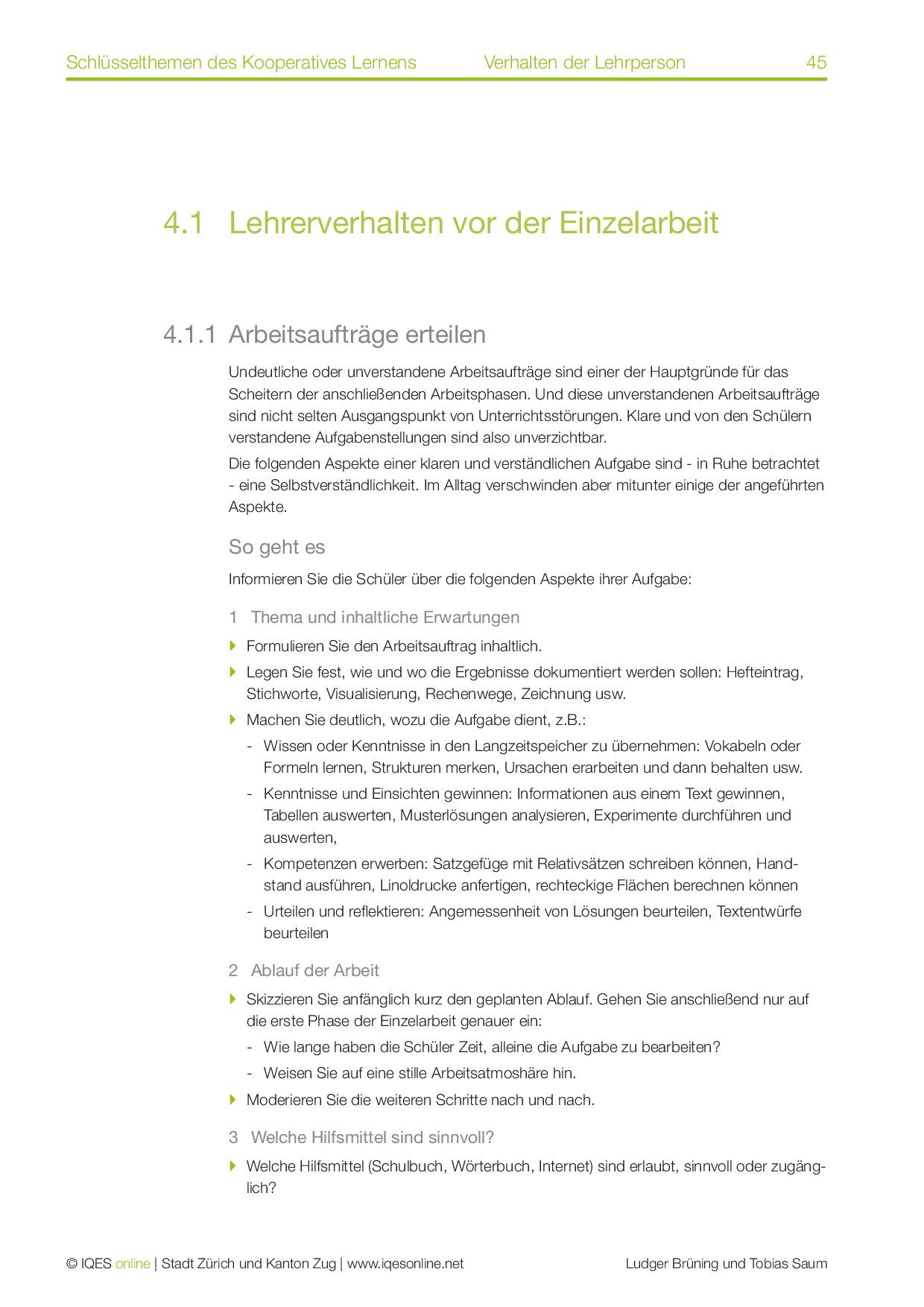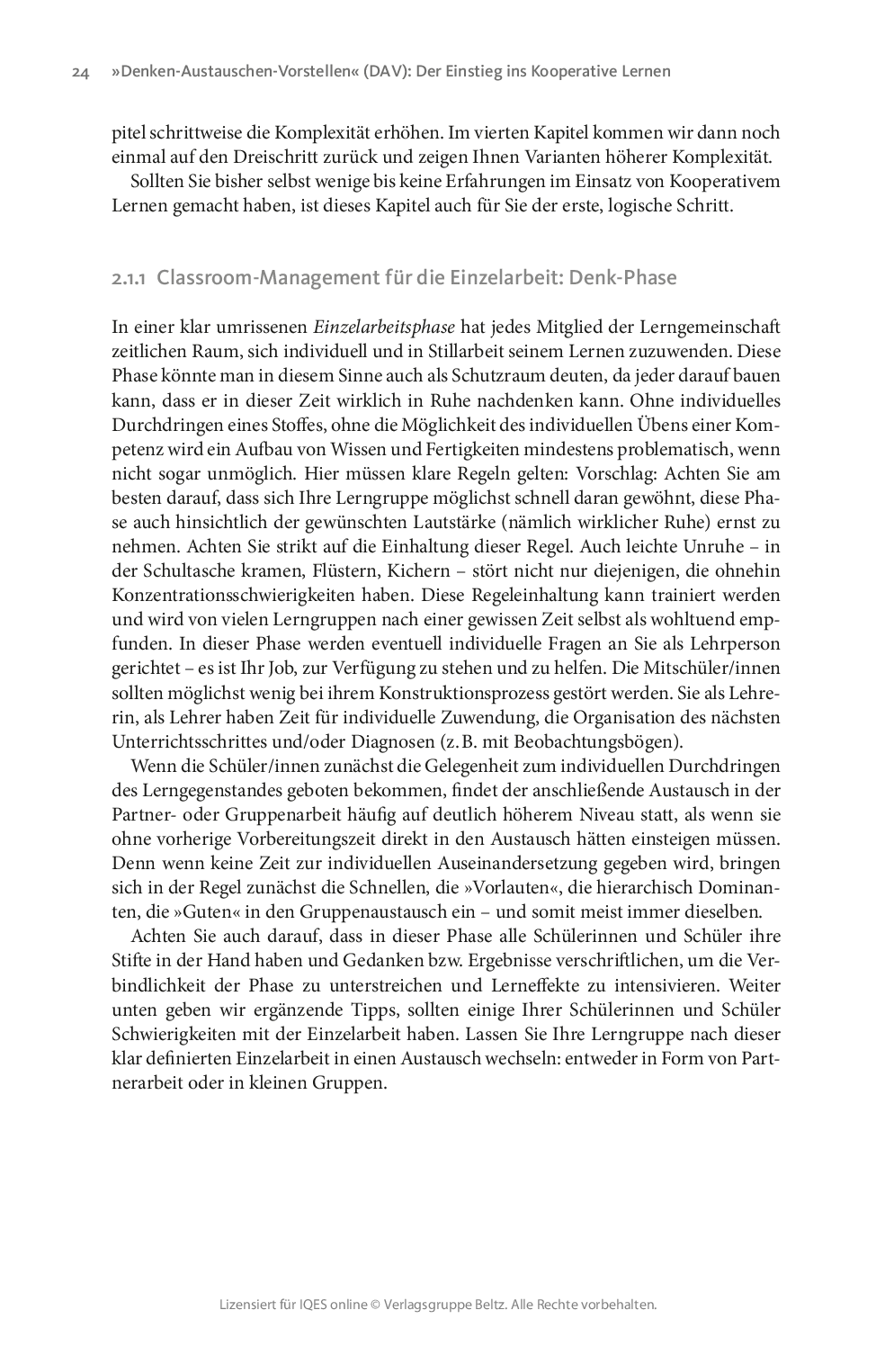 Im 2. Kapitel des «Praxisleitfadens Kooperatives Lernen und Heterogenität» wird das Classroom- Management für die Denk-, die Austausch- und Vorstellungsphase beschrieben. Dabei werden verschiedene Varianten und Methoden für die Partner- und die Gruppenarbeit) praxisnah vorgestellt.