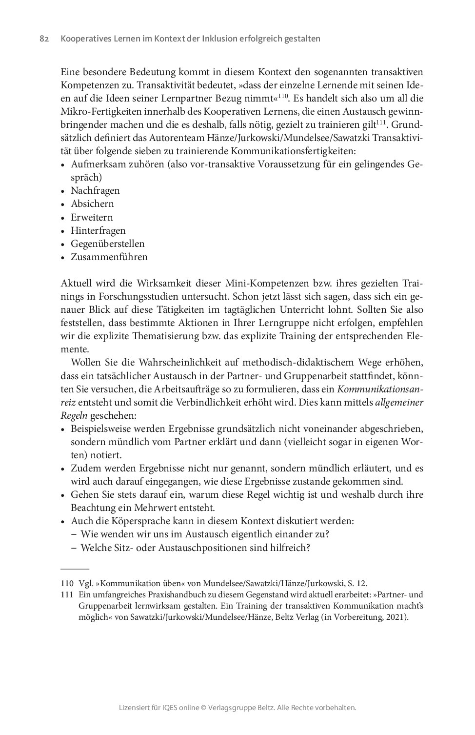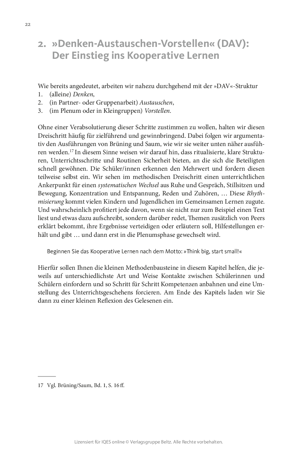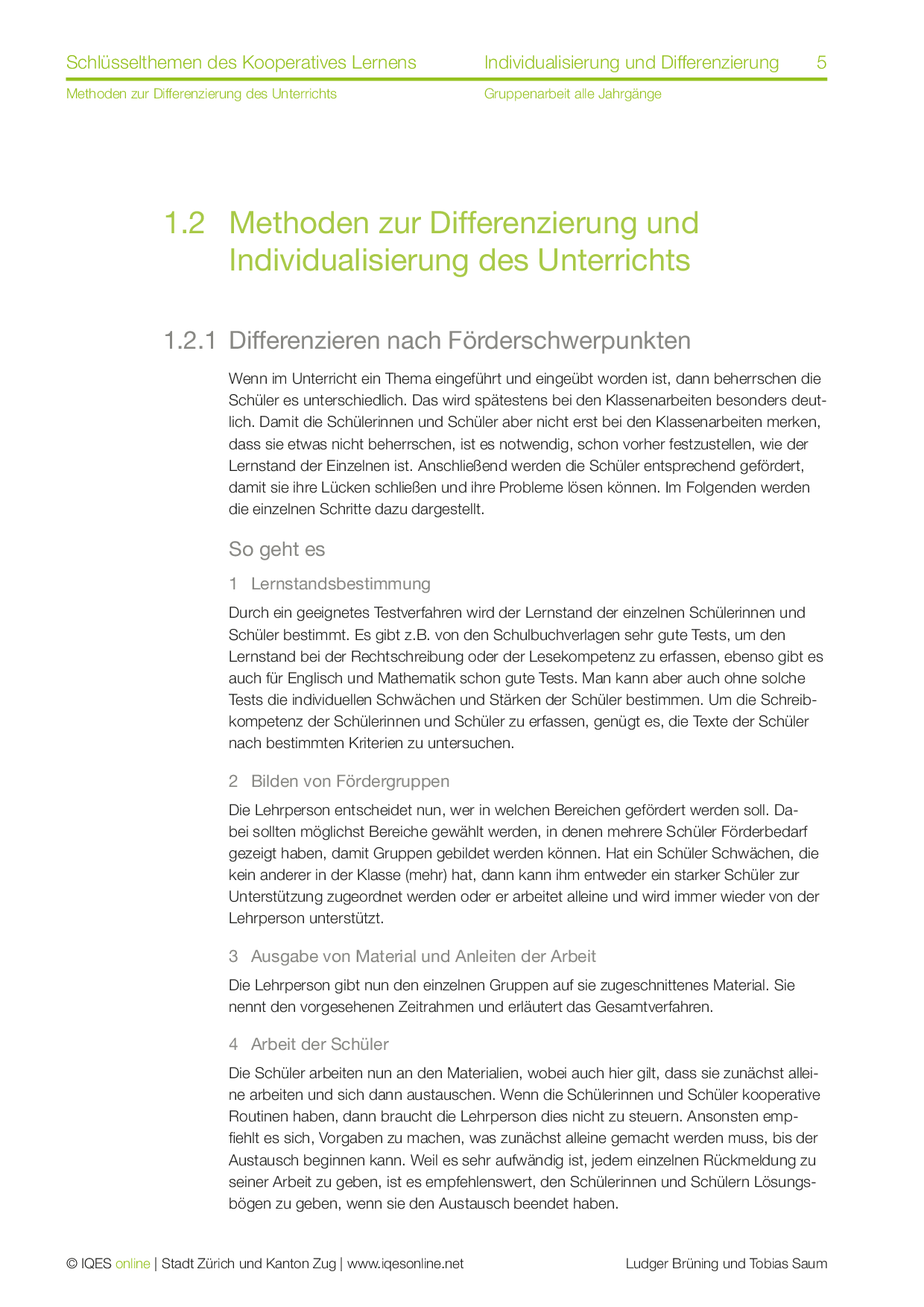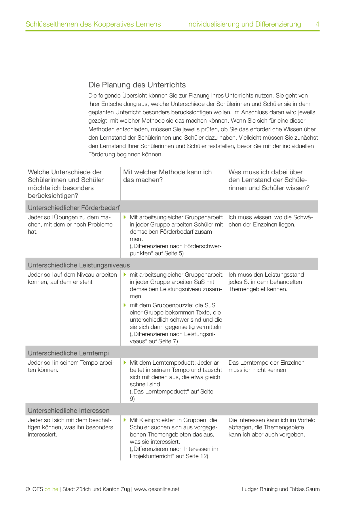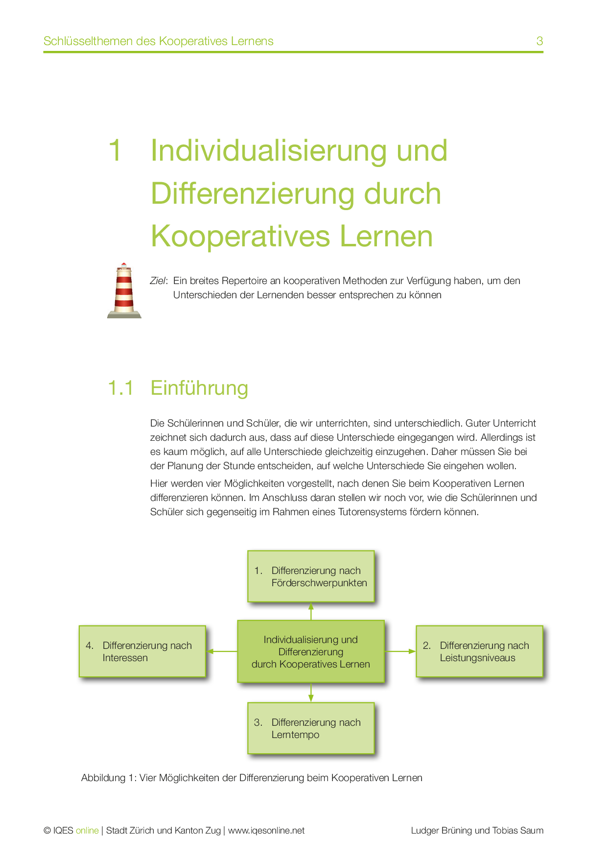 Die Autoren zeigen, dass viele Methoden, die im Rahmen des kooperativen Lernens zum Einsatz kommen, in hohem Masse geeignet sind, individuelle Zugänge und selbstverantwortliches Lernen zu unterstützen.