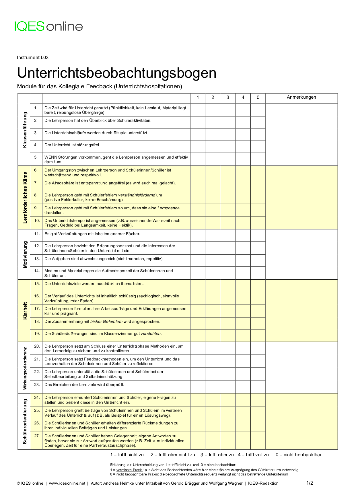 In Kombination mit der Schüler/innenbefragung zur Unterrichtsqualität (S01a - d) und/oder der Selbsteinschätzung (L02) kann die bewusste Wahrnehmung unterschiedlicher Perspektiven die eigene Sichtweise bereichern. Weitere Unterrichtsbeobachtungsbogen mit Fokus Integrative Förderung (L36 und L37).