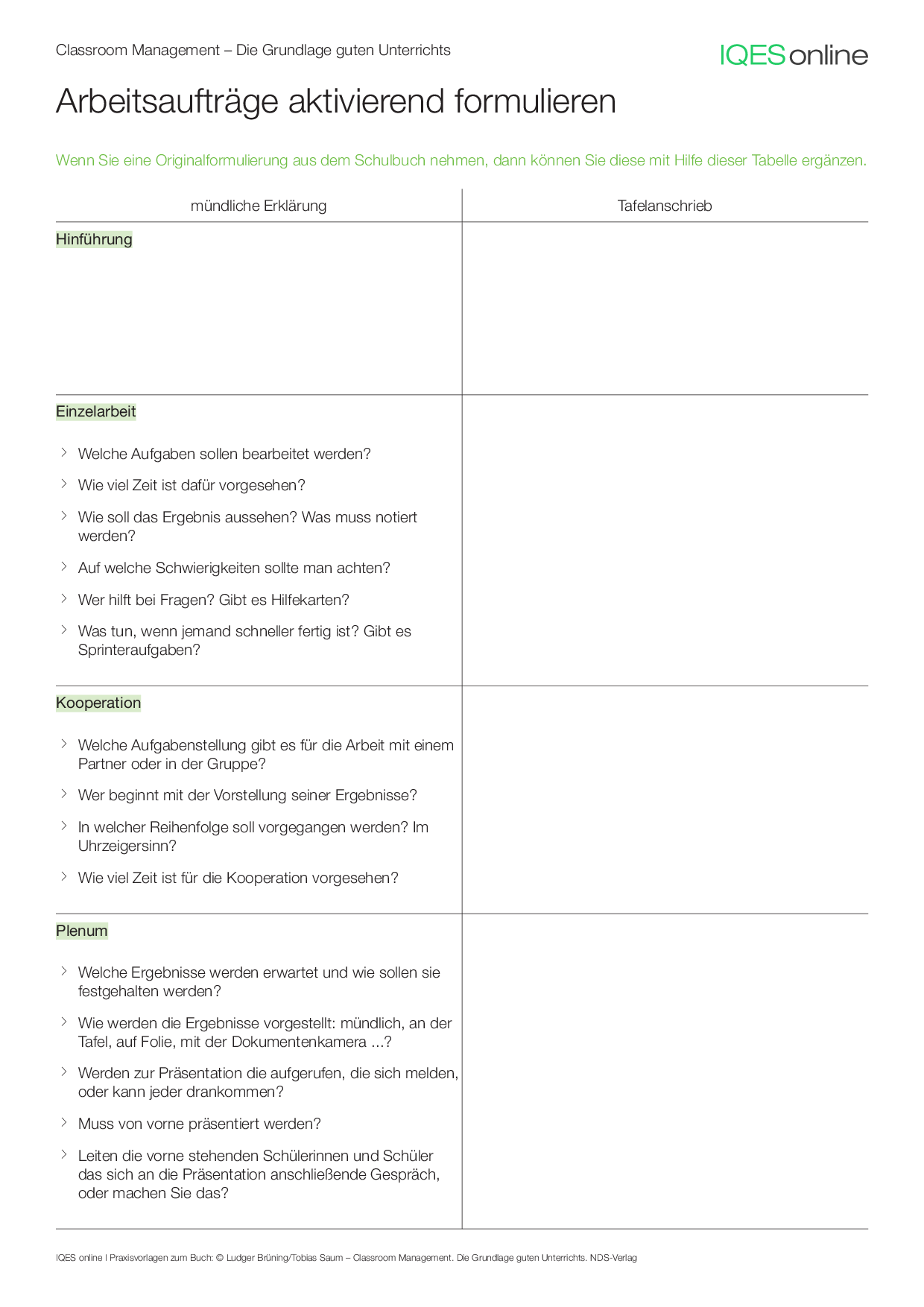 Die Checkliste hilft bei der Formulierung klarer aktivierender Arbeitsaufträge.