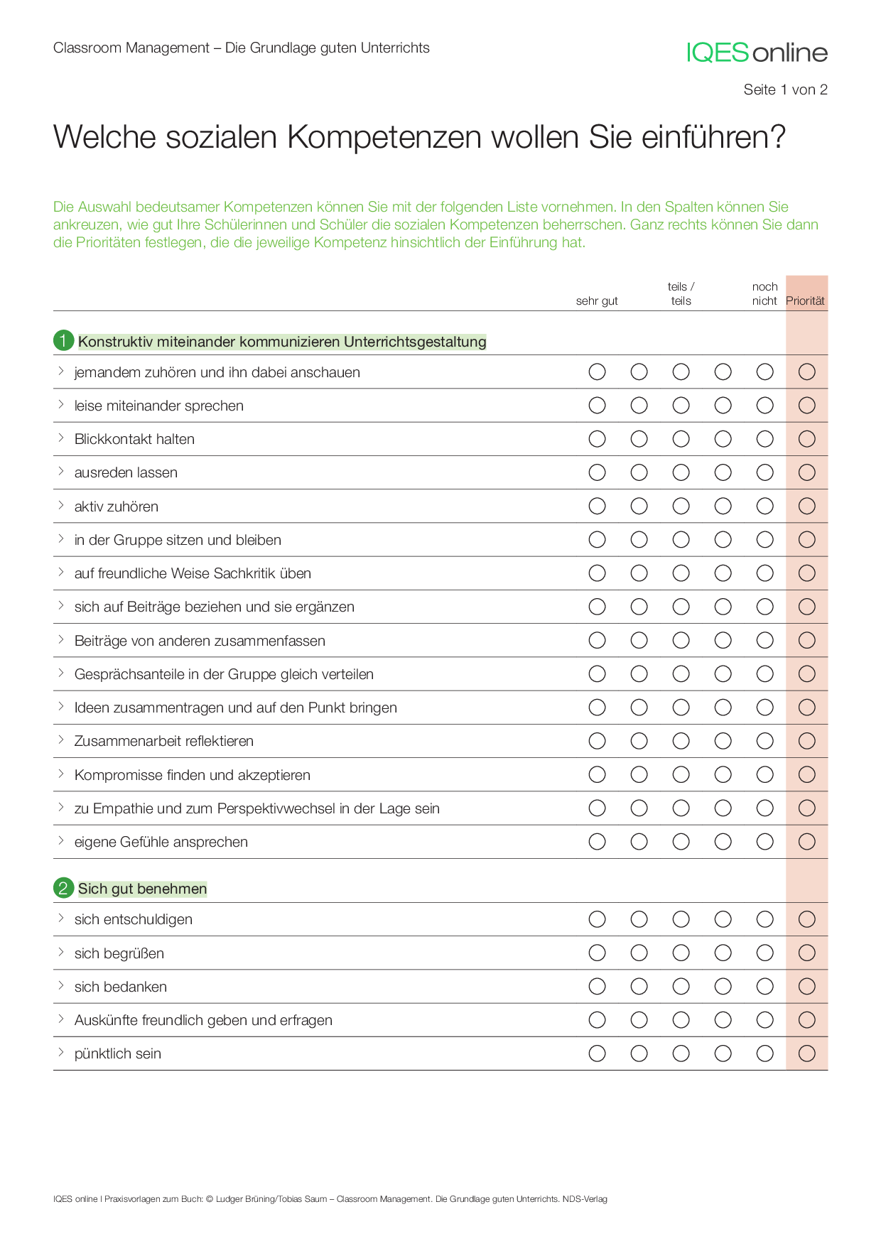 Die Auswahl bedeutsamer sozialer Kompetenzen können Sie mit der folgenden Liste vornehmen. In den Spalten können Sie ankreuzen, wie gut Ihre Schülerinnen und Schüler die Kompetenzen beherrschen. Ganz rechts können Sie dann die Prioritäten festlegen, die die jeweilige Kompetenz hinsichtlich der Einführung hat.