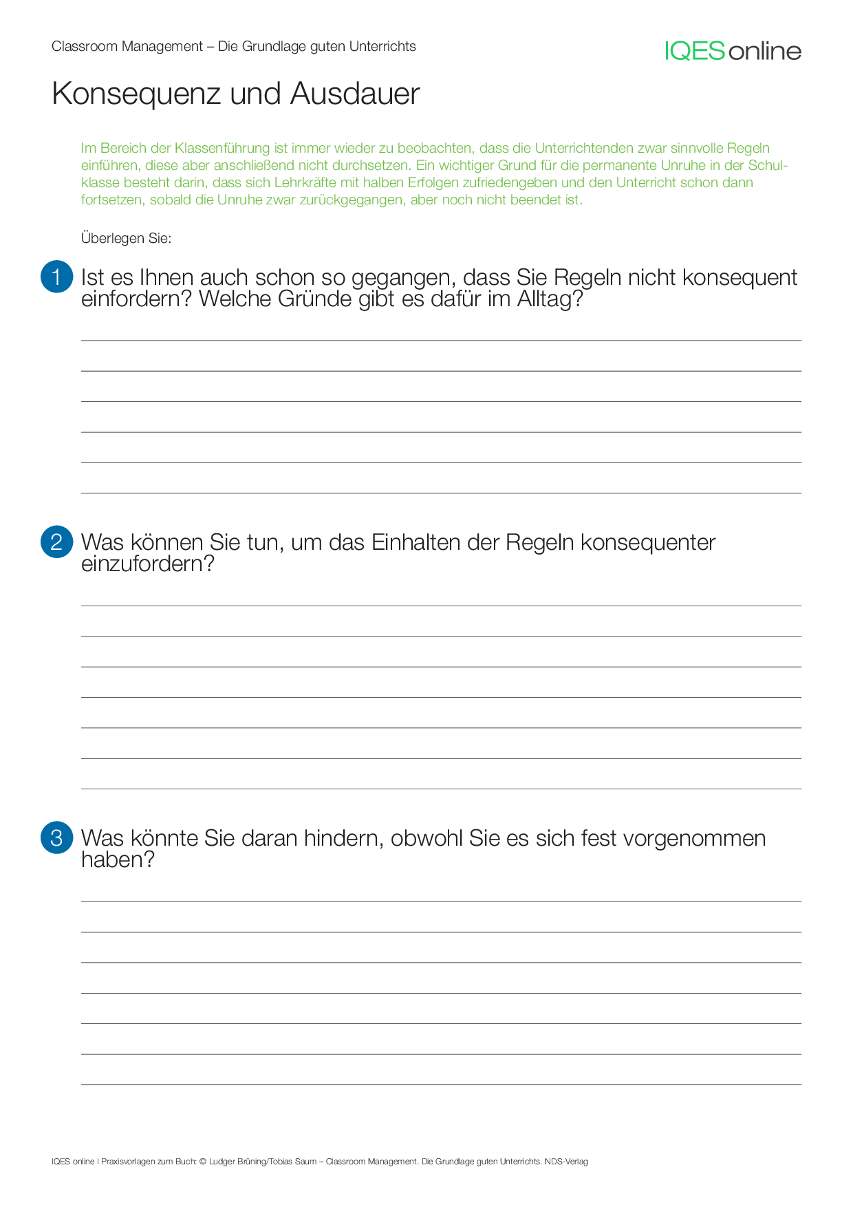 Im Bereich der Klassenführung ist immer wieder zu beobachten, dass die Unterrichtenden zwar sinnvolle Regeln einführen, diese aber anschließend nicht durchsetzen. Ein wichtiger Grund für die permanente Unruhe in der Schulklasse besteht darin, dass sich Lehrkräfte mit halben Erfolgen zufriedengeben und den Unterricht schon dann fortsetzen, sobald die Unruhe zwar zurückgegangen, aber noch nicht beendet ist.
