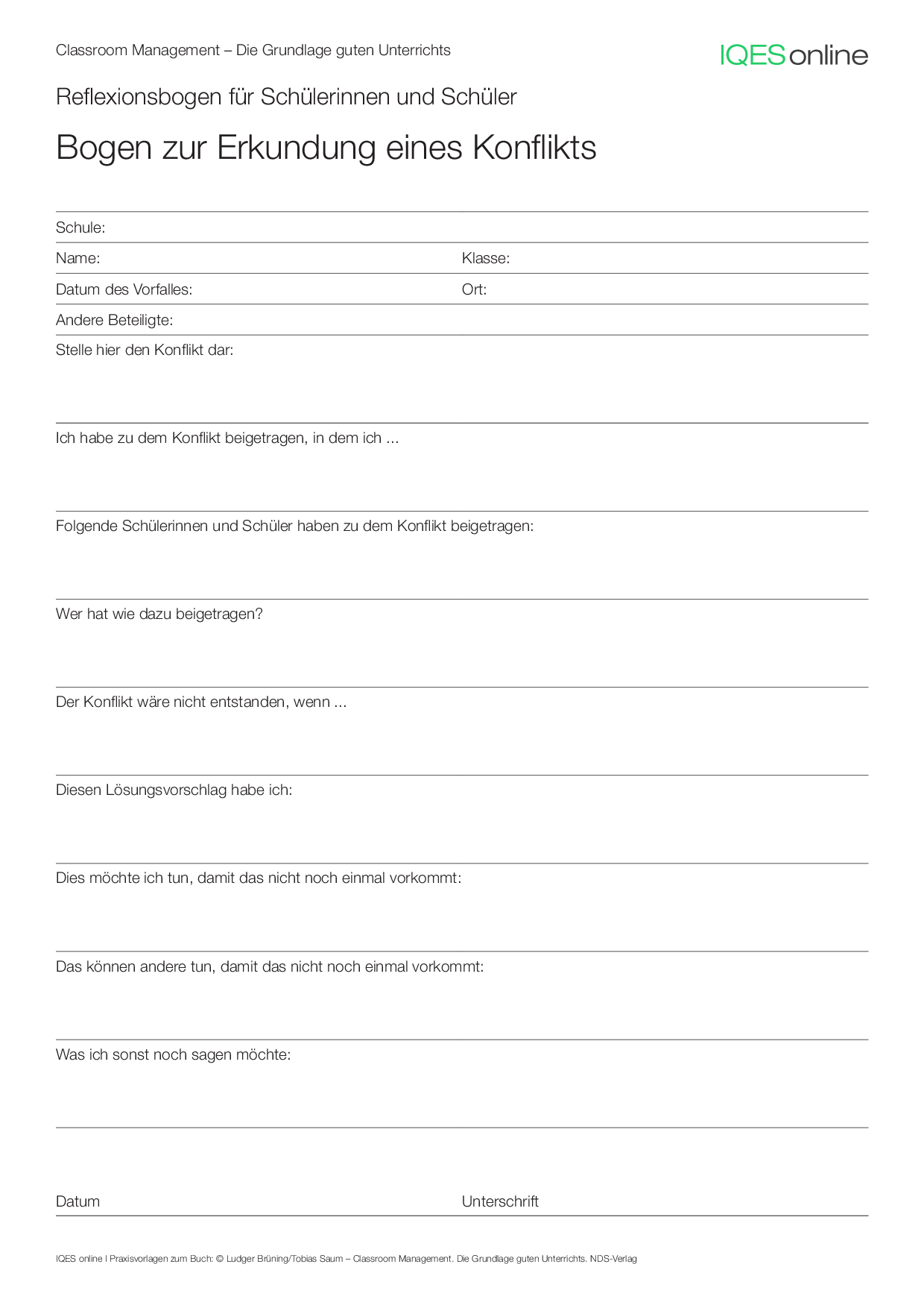 Der Reflexionsbogen lädt Schülerinnen und Schüler dazu ein, über ihren Beitrag zum Entstehen und zur Lösung eines Konflikts nachzudenken.
