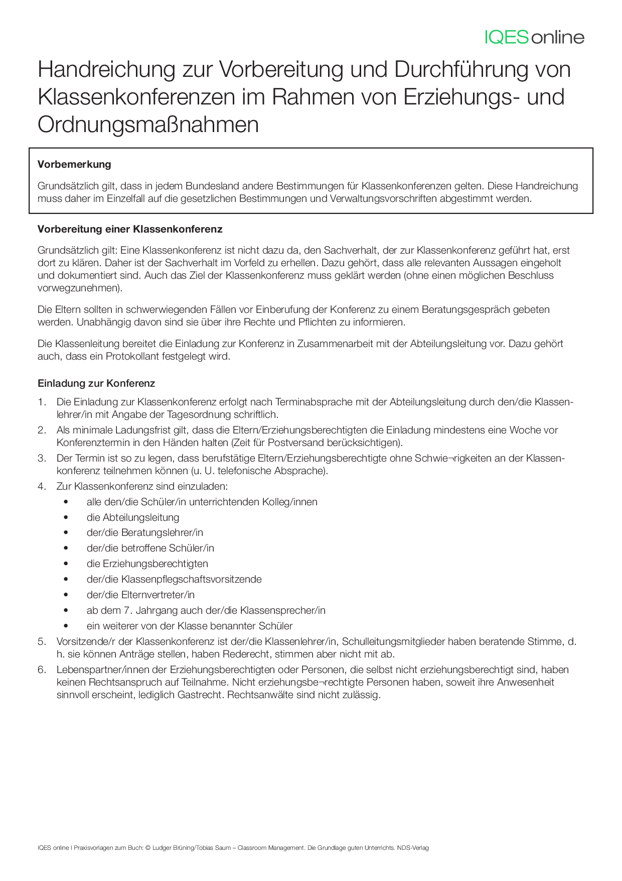 Handreichung zur Vorbereitung und Durchführung von Klassenkonferenzen im Rahmen von Erziehungs- und Ordnungsmaßnahmen. Mit Beispielen: Agenda für Jahrgangsteams und ganze Schulen, Protokoll und Elternbrief