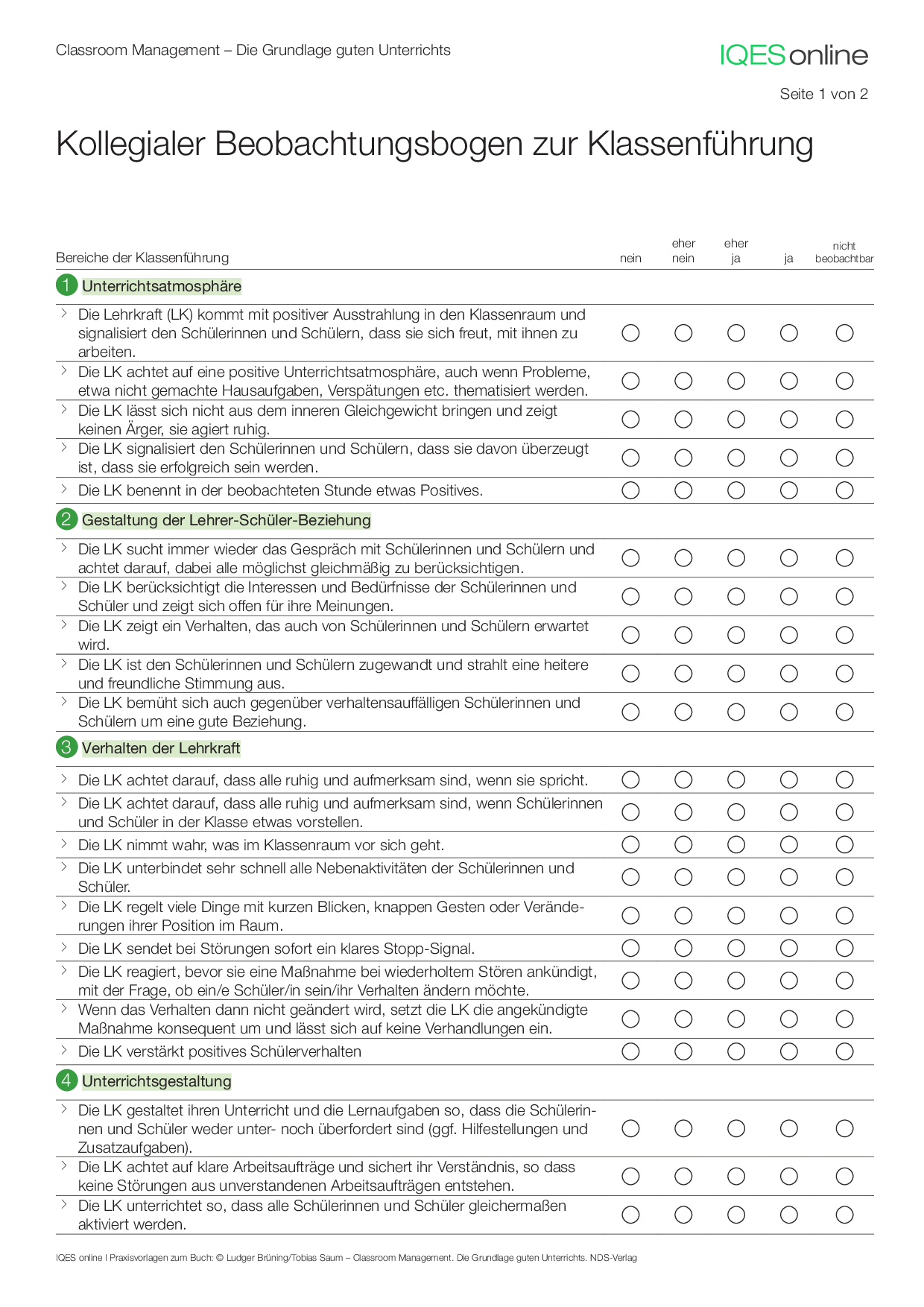 Der Bogen wirft einen Blick auf die Schulorganisation und -leitung. Er kann sowohl von Schulleitungen, aber auch Kollegien (dann sprachlich etwas angepasst) verwendet werden, um das schulweite Classroom Management in den Blick zu nehmen.