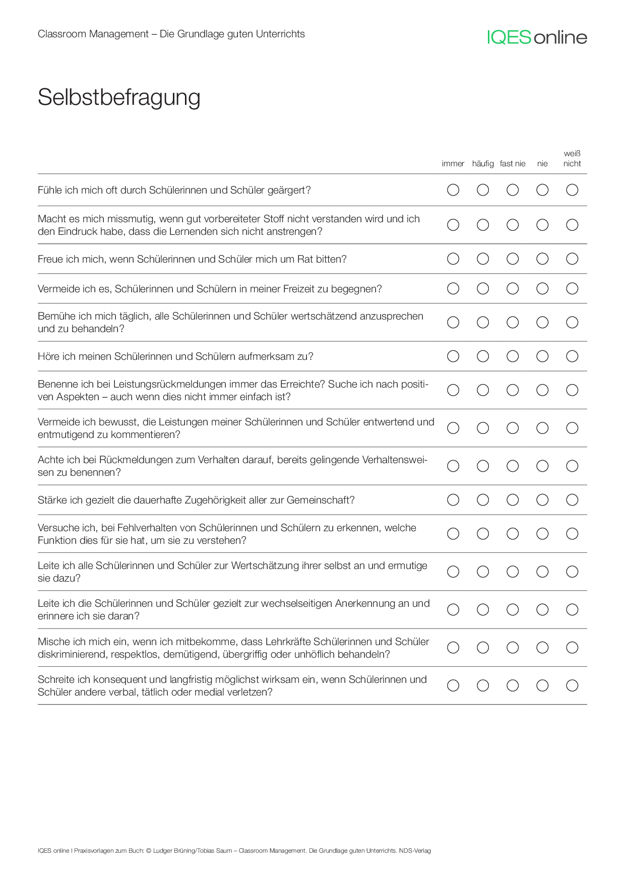 Gibt es schulweit gültige Grundsätze zum gemeinsamen Erziehungshandeln? Gibt es ein einheitliches Vorgehen bei Fehlverhalten von Schülerinnen und Schülern, das in einer festgelegten Stufenfolge von Reaktionen und Konsequenzen besteht? Gibt es eingeführte Verfahren, mit denen die Fachlehrkräfte das Verhalten von Schülerinnen und Schülern an die Klassenlehrkräfte rückmelden? Gibt es ein schulweites Konzept zur Verstärkung von positiven Schülerverhalten? Besteht für die Lehrkräfte ein Unterstützungssystem, wenn es darum geht, dass Lehrkräfte bestimmte Herausforderungen bewältigen müssen? Führt die Schulleitung mit den Lehrkräften schwierige Elterngespräche und steht ihnen so zur Seite? Gibt es innerhalb der Schulleitung ein Instrument zur Reflexion des eigenen Führungsverhaltens? Wird die Möglichkeit der Hospitation von der Schulleitung aktiv gefördert?