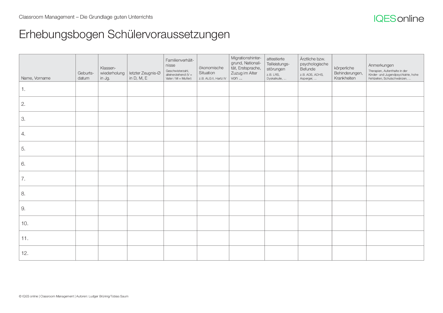 Ein Klassenbogen zur Erhebung der individuellen Voraussetzungen der Schüler:innen.