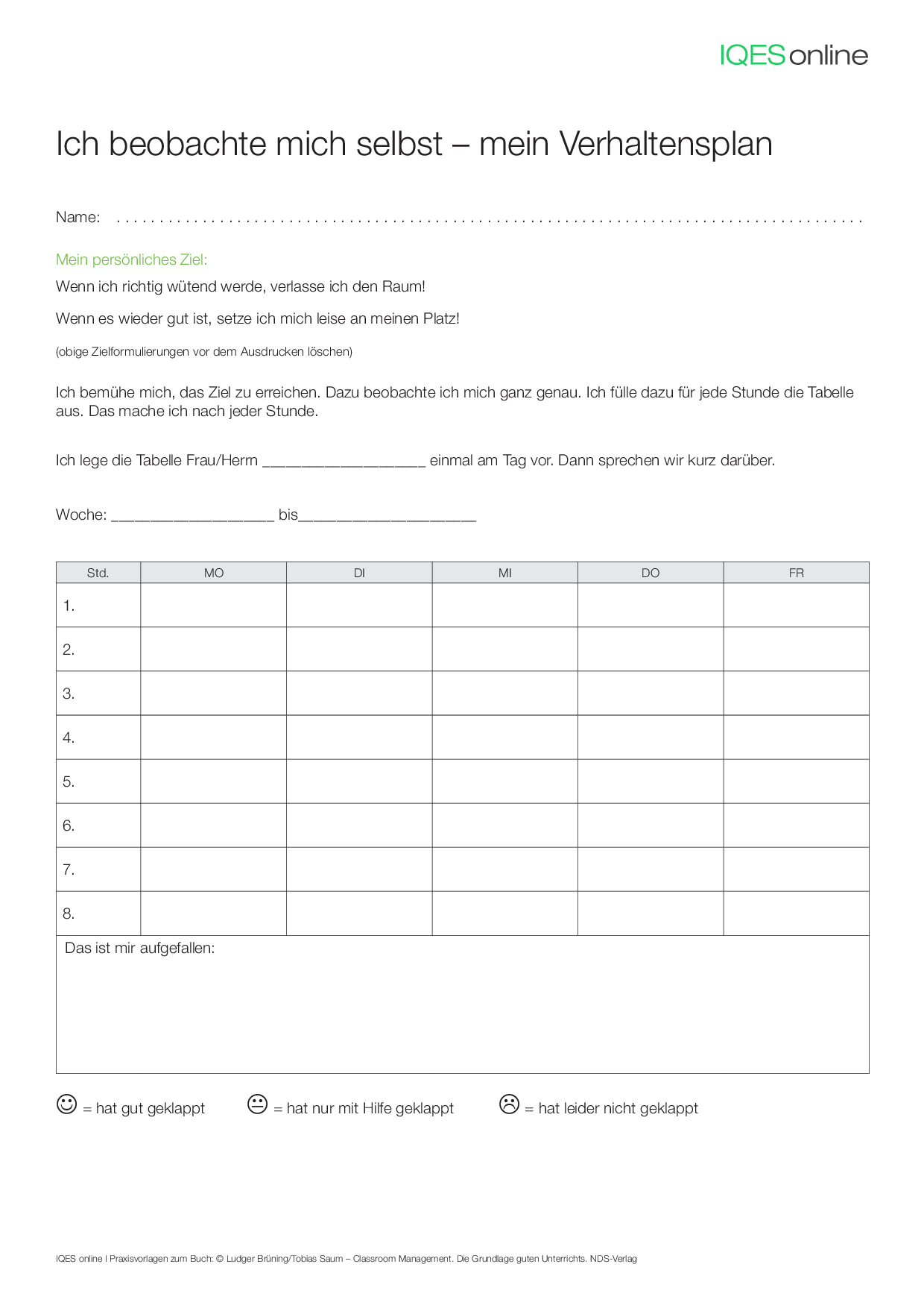Zwei Vorlagen für einen Verhaltensvertrag mit Varianten von Selbstbeobachtungsbogen.
