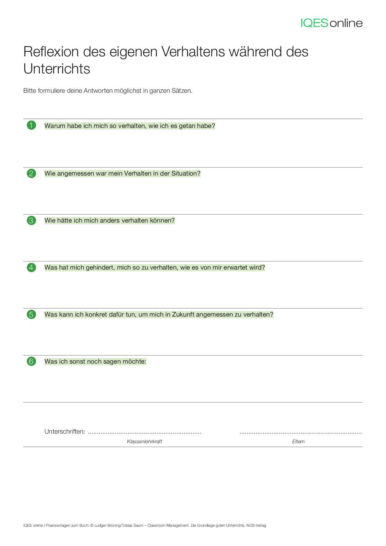 Der Reflexionsbogen für Schülerinnen und Schüler regt zur Reflexion des eigenen Verhaltens gegenüber der Lehrkraft und Mitschüler:innen an.