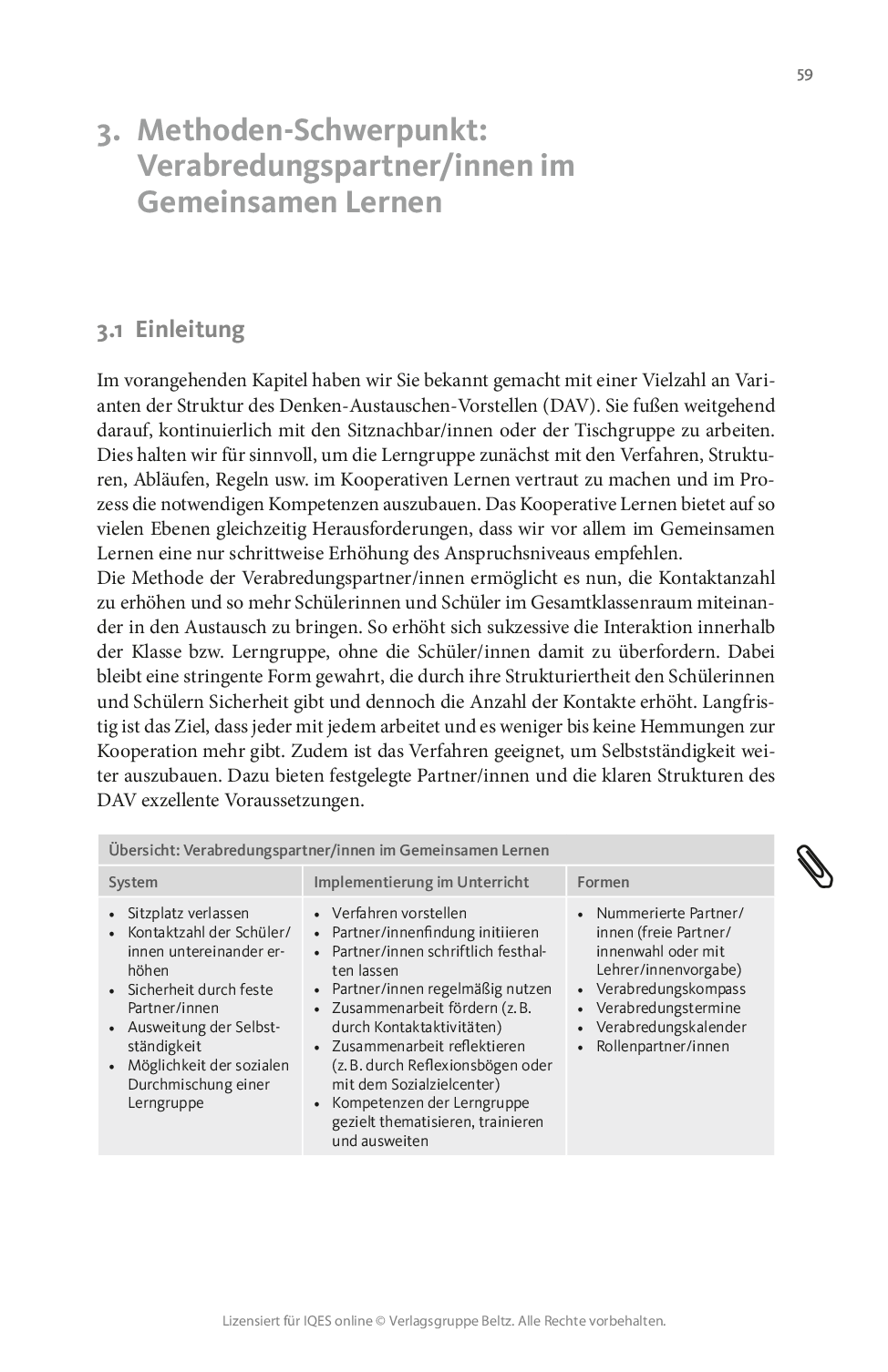 Im 3. Kapitel des «Praxisleitfadens Kooperatives Lernen und Heterogenität» wird die Methode der Verabredungspartner/innen praxisnah beschrieben. Diese ermöglicht es, die Kontaktanzahl zu erhöhen und so mehr Schülerinnen und Schüler im Gesamtklassenraum miteinander in den Austausch zu bringen. So erhöht sich sukzessive die Interaktion innerhalb der Klasse bzw. Lerngruppe, ohne die Schüler/innen damit zu überfordern.