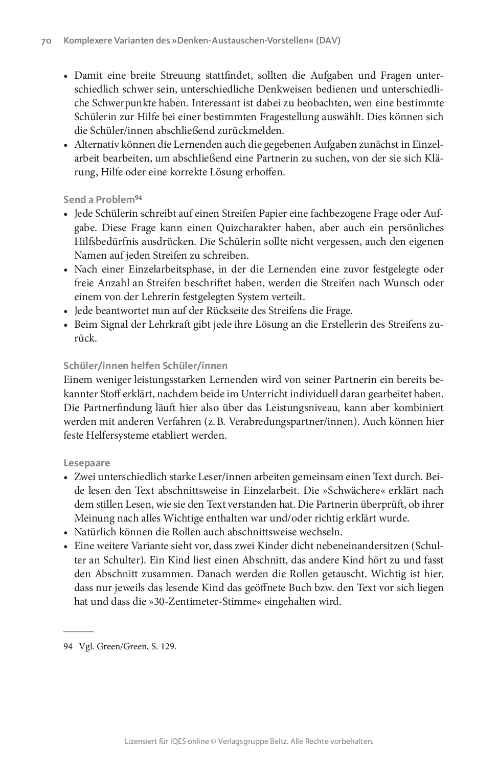 Im 4. Kapitel des «Praxisleitfadens Kooperatives Lernen und Heterogenität» werden offenere und/oder komplexere Formen des kooperativen Dreischritts vorgestellt. Diese Varianten erfordern seitens der Schüler/innen mehr Selbststeuerung, mehr Kompetenz im Umgang mit Offenheit, im Austauschen und in der gegenseitigen Unterstützung und nicht zuletzt mehr Sensibilität im Umgang mit der oder dem Anderen. Auch hier können viele der Verfahren über die Partnerarbeit hinaus innerhalb einer Tischgruppe oder in neu zusammengesetzten Teams angelegt werden.