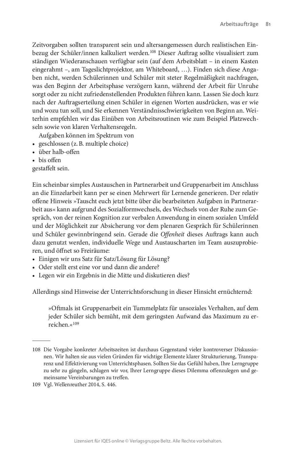 Es hilft, wenn sich die Lehrperson schon bei der Unterrichtsvorbereitung überlegt, welche Handlungen mit welchem Zweck sie in den jeweiligen Unterrichtssituationen vollziehen wird: vor der Einzelarbeit, während der Einzelarbeit, während der Kooperationsphase, in der Präsentations- und Plenumsphase.