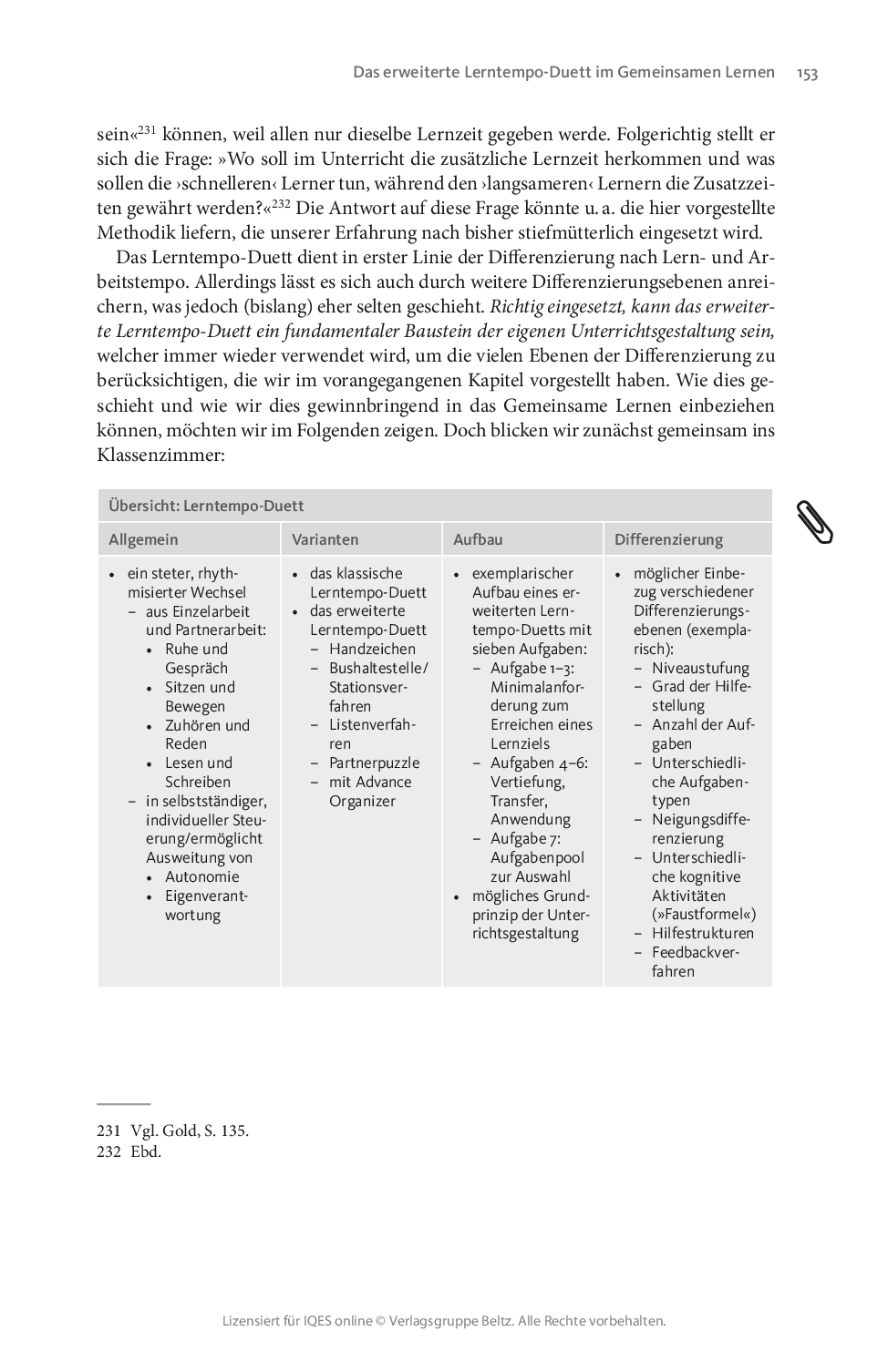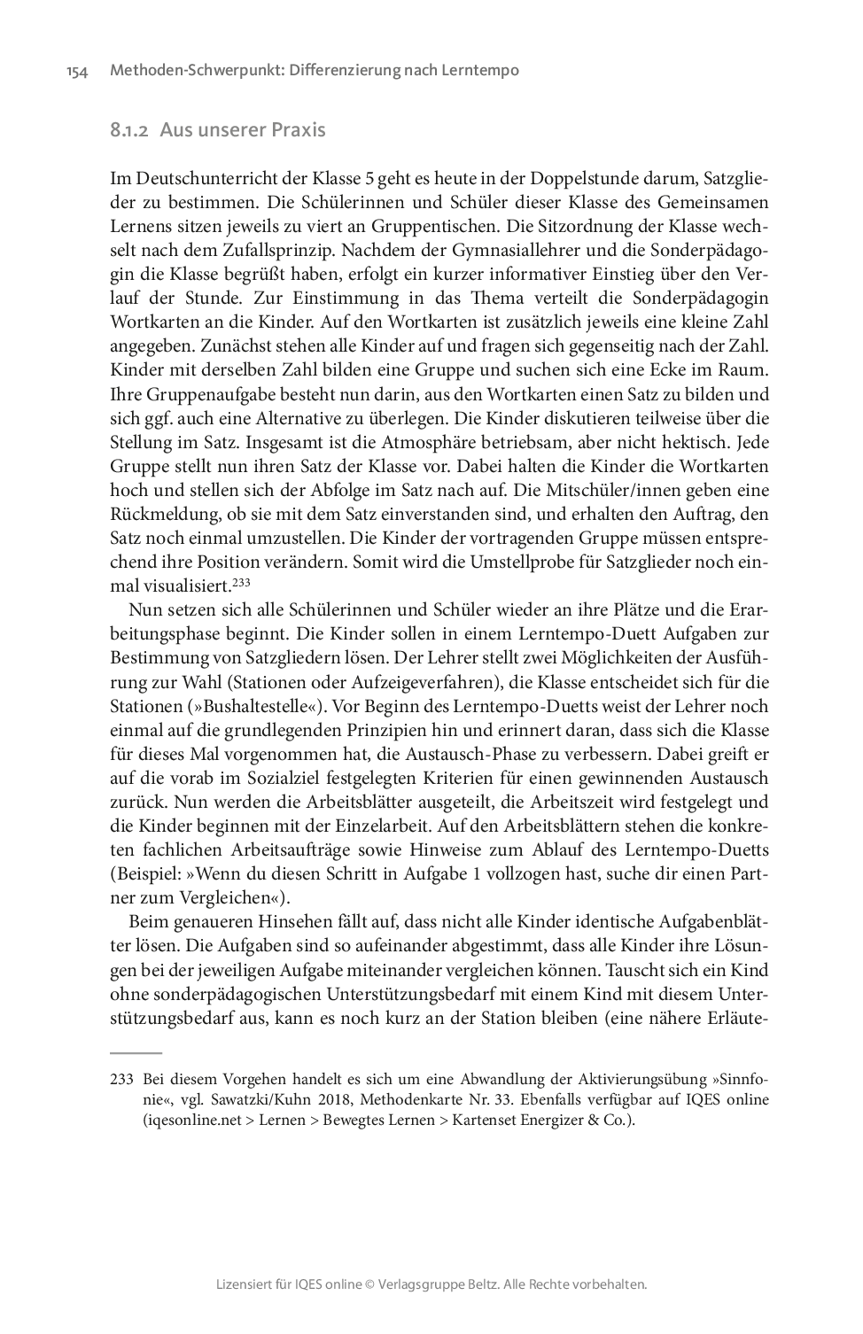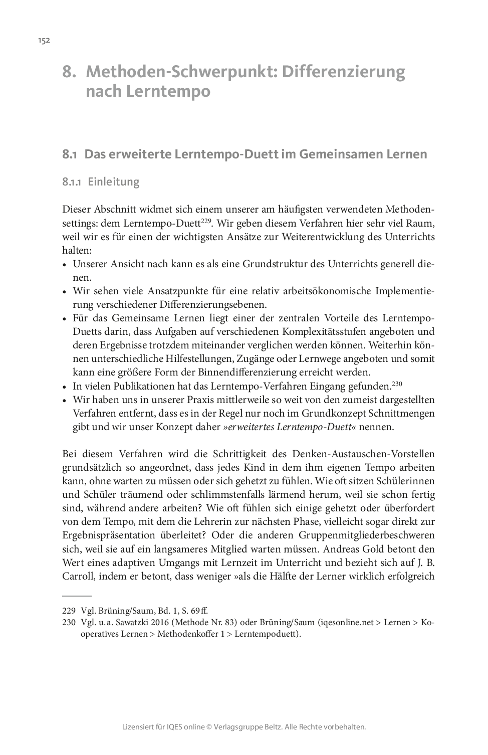 Das 8. Kapitel des «Praxisleitfadens Kooperatives Lernen und Heterogenität» ist einer am häufigsten verwendeten Methodensettings gewidmet: dem Lerntempo-Duett. Das Lerntempo-Duett dient in erster Linie der Differenzierung nach Lern- und Arbeitstempo. Allerdings lässt es sich auch durch weitere Differenzierungsebenen anreichern, was großes Potential für einen lernförderlichen Umgang mit unterschiedlichen Voraussetzungen und Interessen bietet.