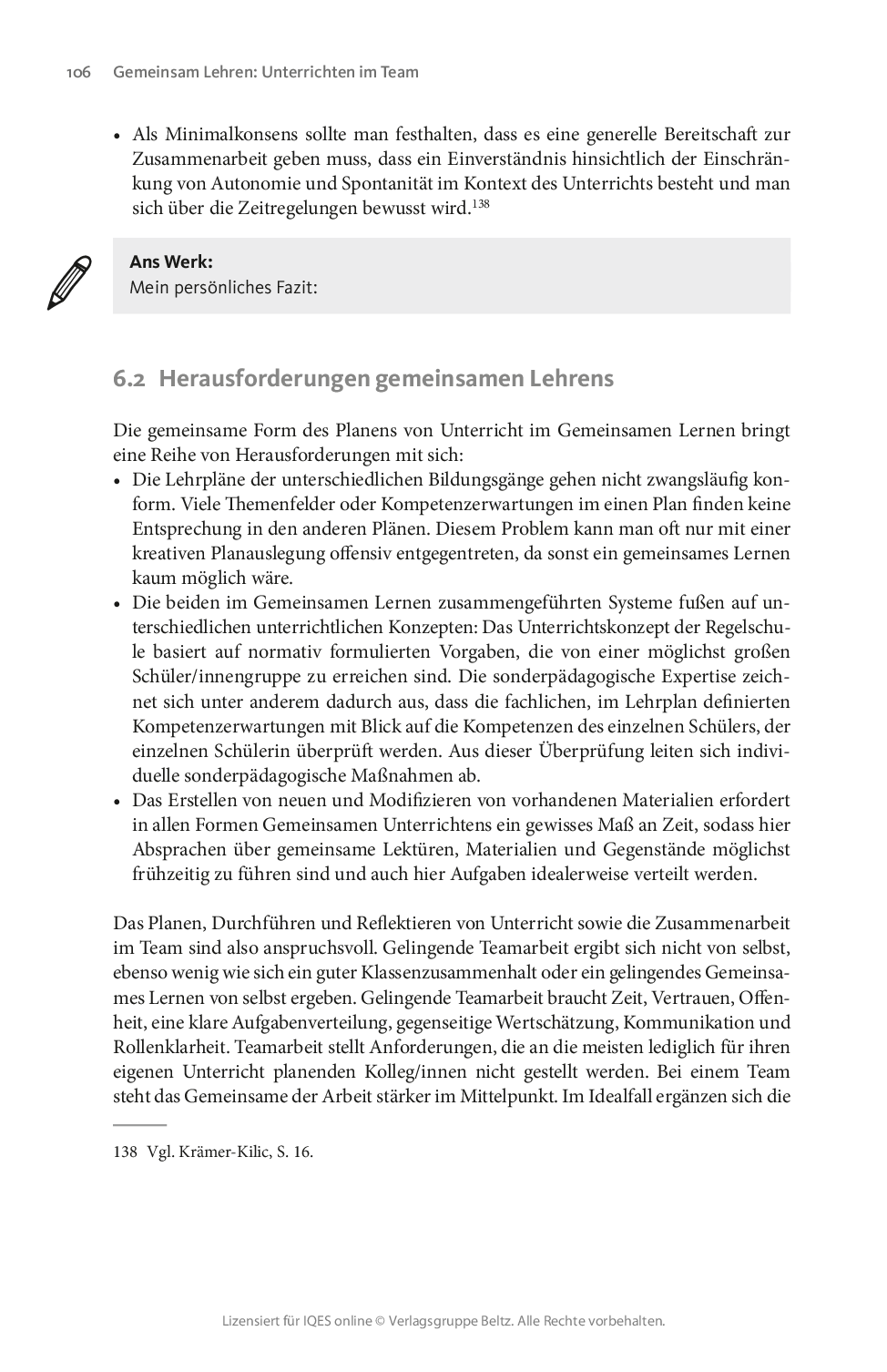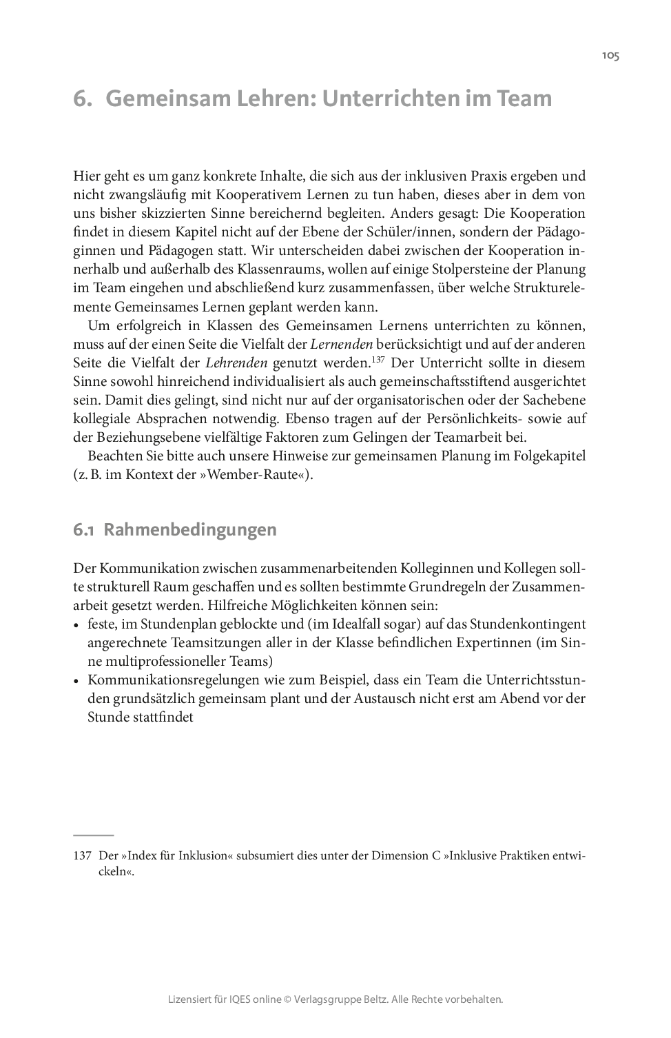 Um erfolgreich in Klassen des Gemeinsamen Lernens unterrichten zu können, muss auf der einen Seite die Vielfalt der Lernenden berücksichtigt und auf der anderen Seite die Vielfalt der Lehrenden genutzt werden. Der Unterricht sollte in diesem Sinne sowohl hinreichend individualisiert als auch gemeinschaftsstiftend ausgerichtet sein. Damit dies gelingt, sind nicht nur auf der organisatorischen oder der Sachebene kollegiale Absprachen notwendig. Im 6. Kapitel des «Praxisleitfadens Kooperatives Lernen und Heterogenität» werden bewährte Formen der Kooperation und des gemeinsamen Lehrens beschrieben.