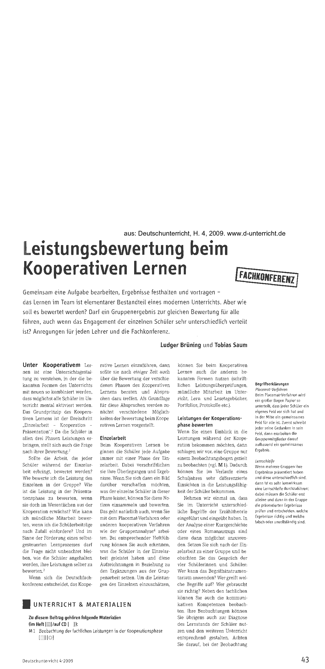 Dieser Fachartikel behandelt die Thematik der Leistungsbewertung beim Kooperativen Lernen. Es wird dabei unter anderem auf die Frage eingegangen, ob ein Gruppenergebnis zur gleichen Bewertung aller führen darf.
