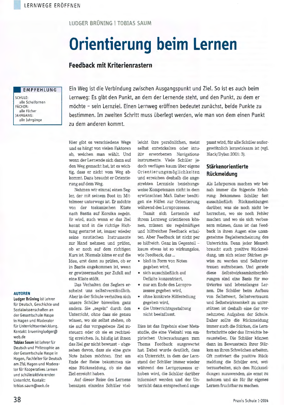 Die Autoren plädieren dafür, regelmässig Rückmeldungen an die Lernenden zu geben und die Rückmeldungen in den Unterricht einzuplanen. Im Anhang finden sich eine Reihe von kriterienorientierten Bewertungsrastern für die Sekundarstufe.