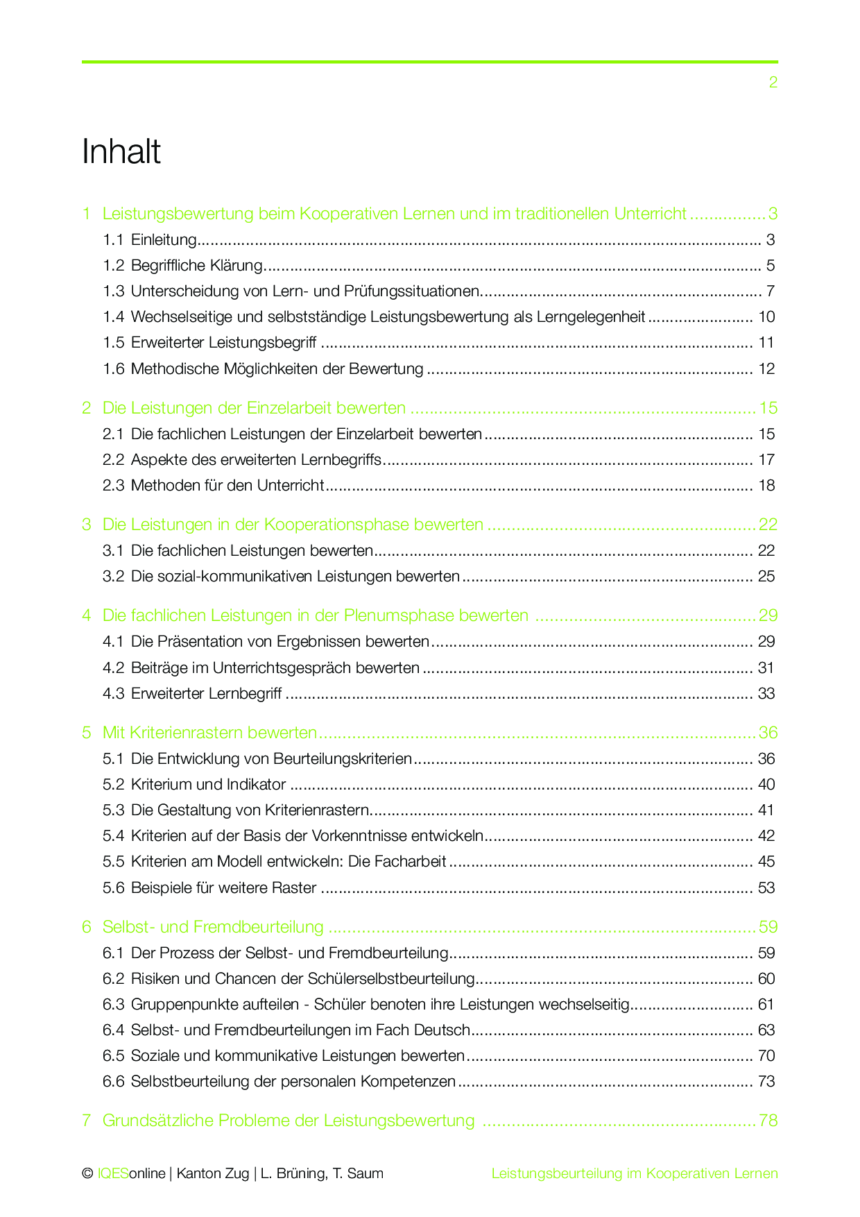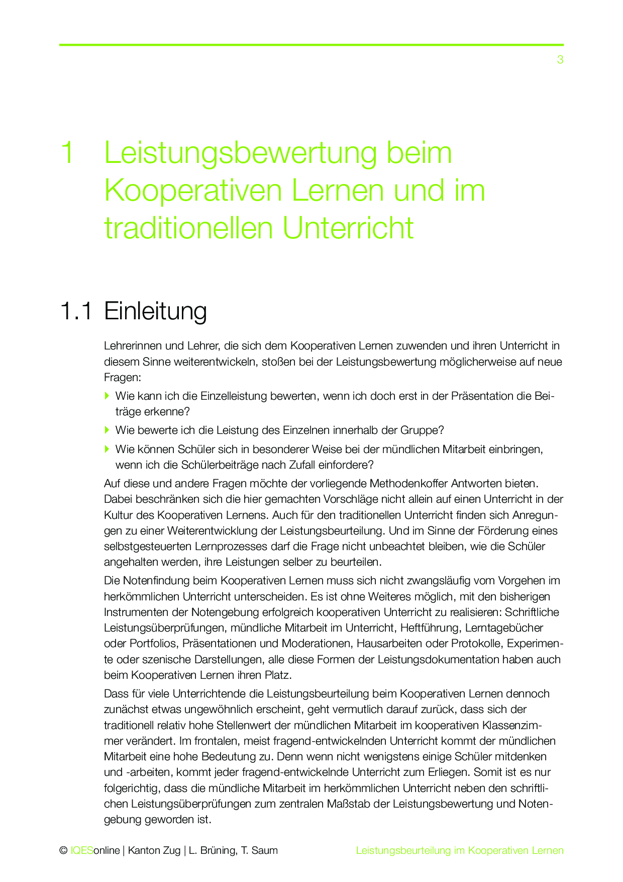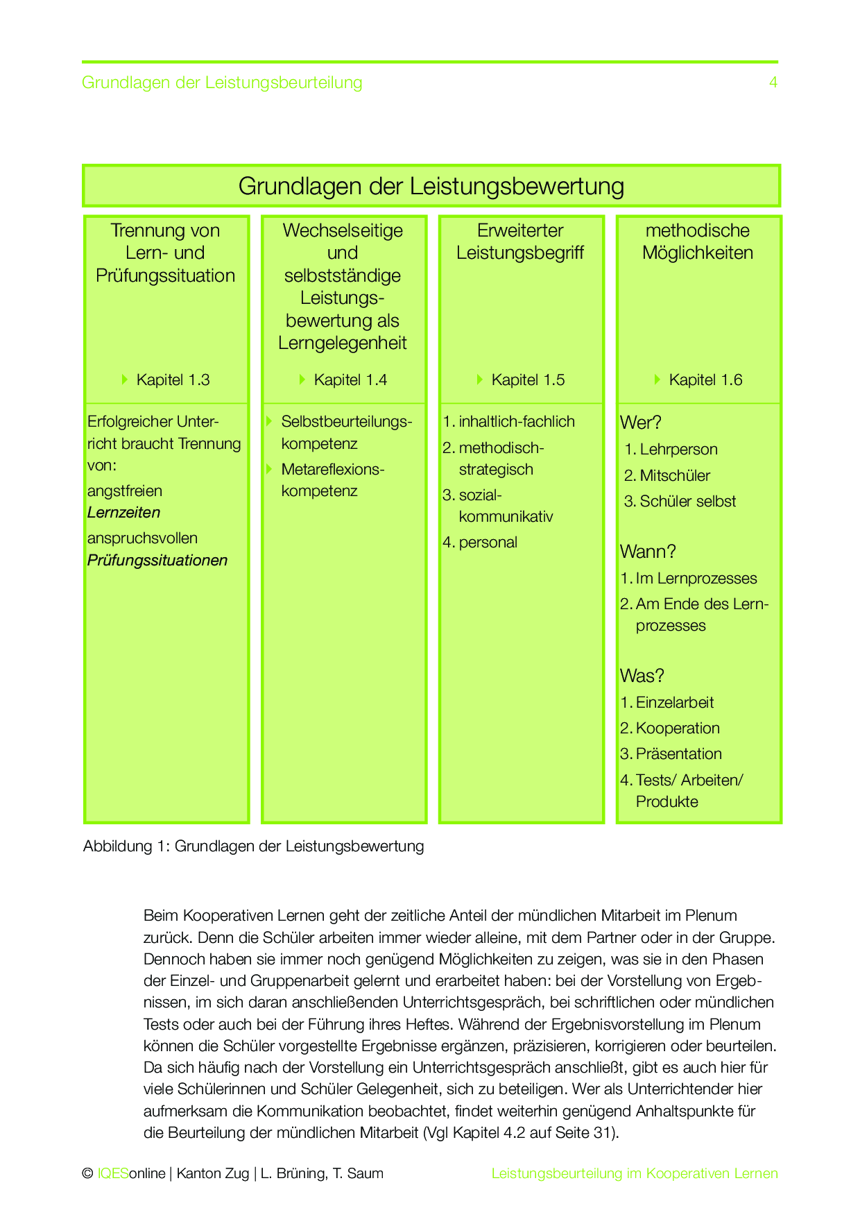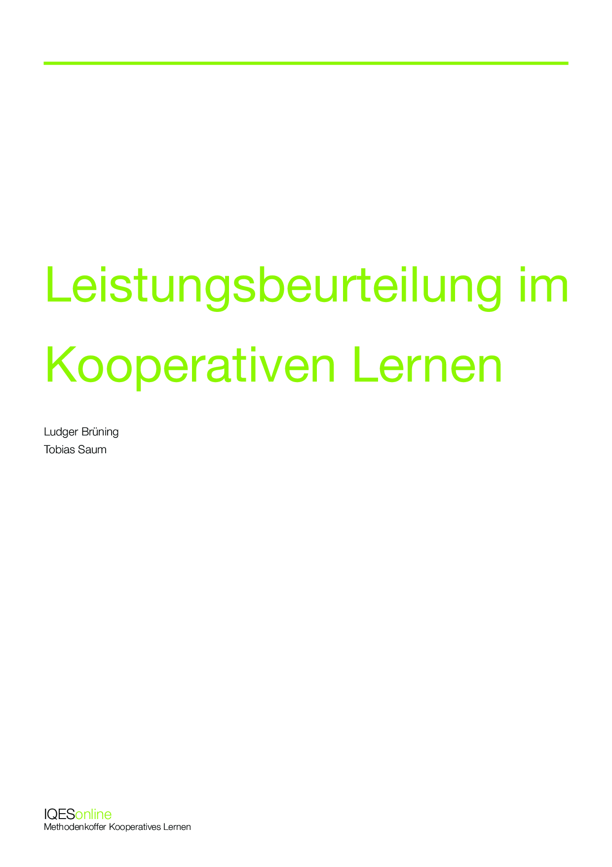 Aus ihrer langjährigen Erfahrung zeigen die beiden Autoren, wie die Leistungen der Schülerinnen und Schüler im Kooperativen Lernen bewertet werden können. Es werden folgende Themen behandelt: