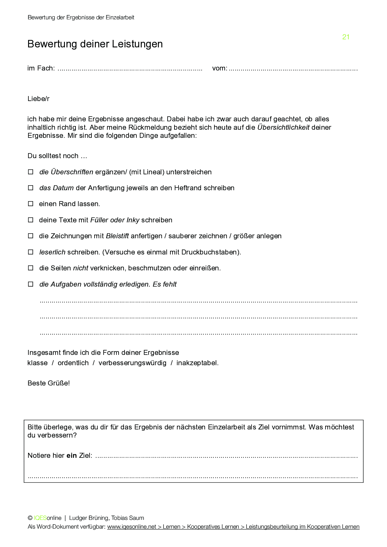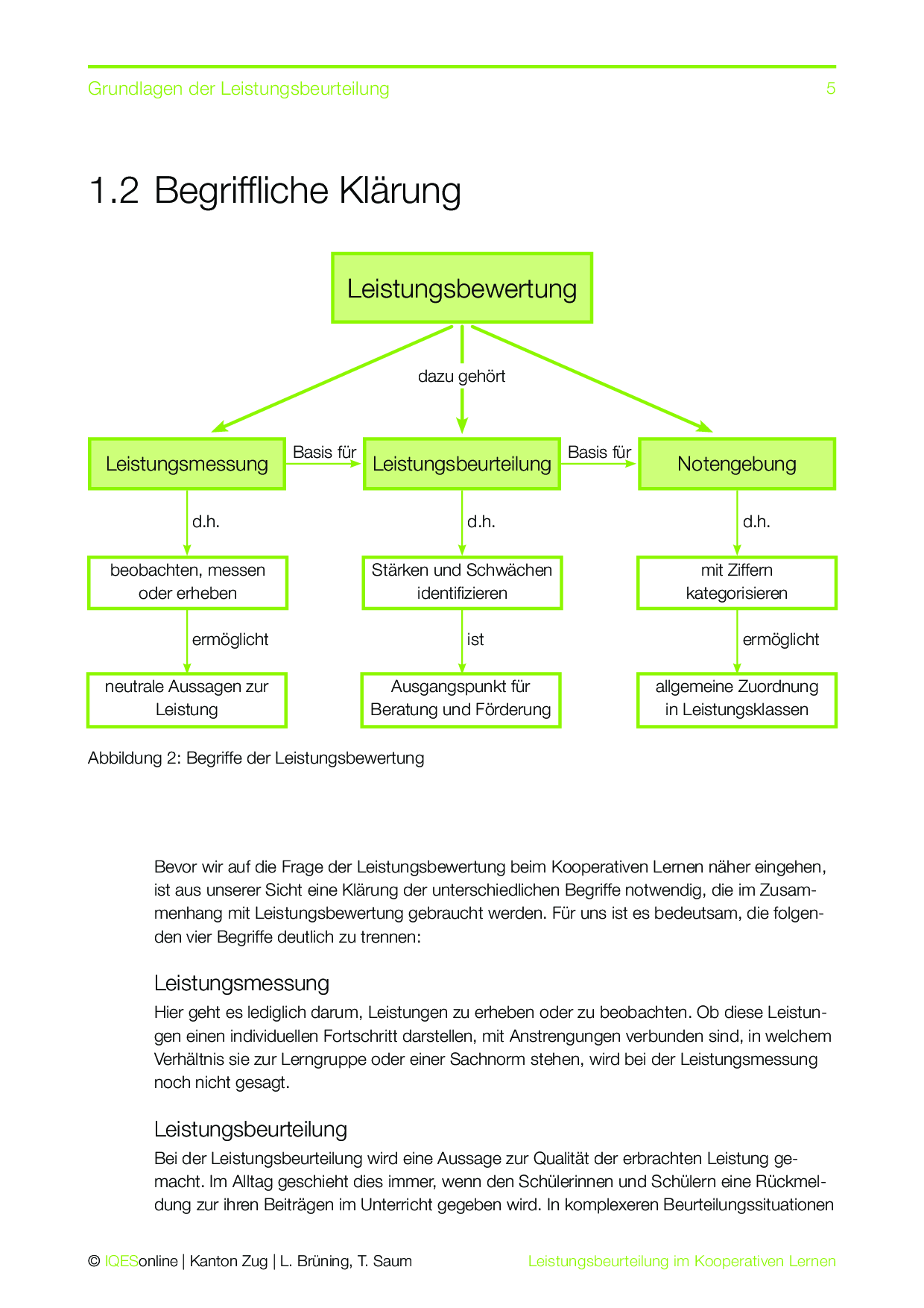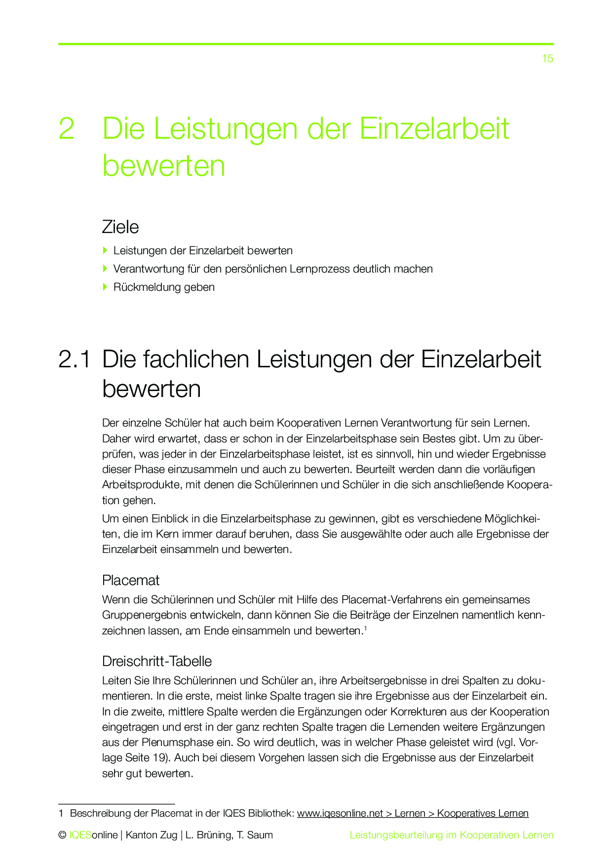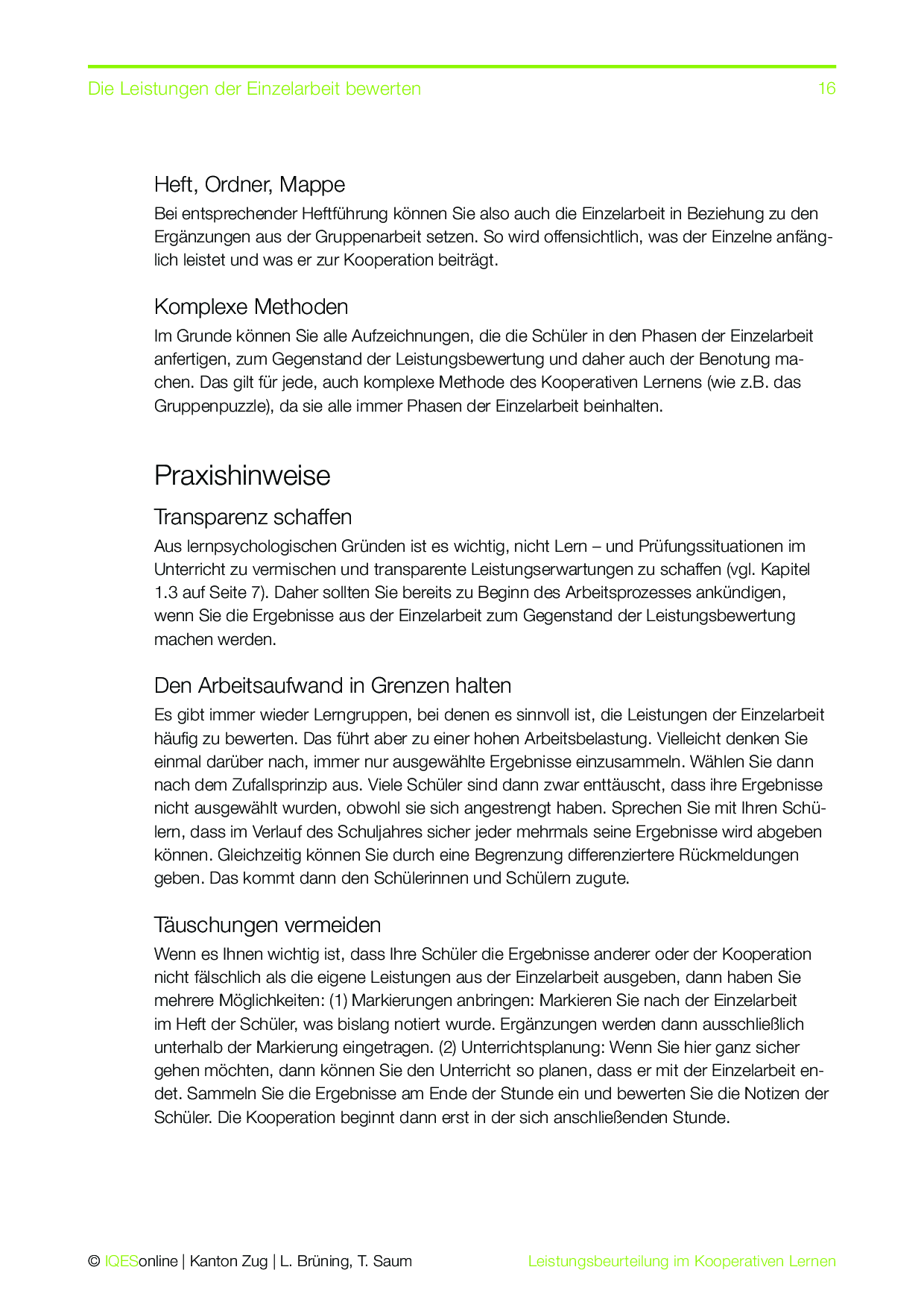 Aus ihrer langjährigen Erfahrung zeigen die beiden Autoren, wie die Leistungen der Schülerinnen und Schüler im Kooperativen Lernen bewertet werden können. Es werden folgende Themen behandelt: