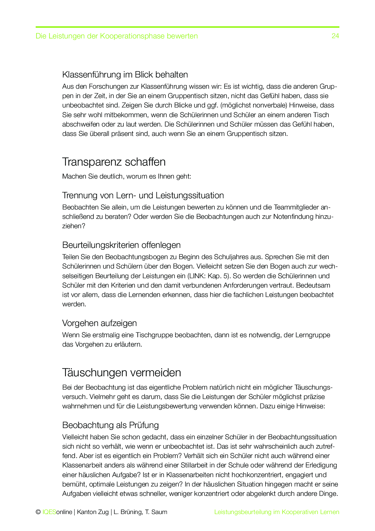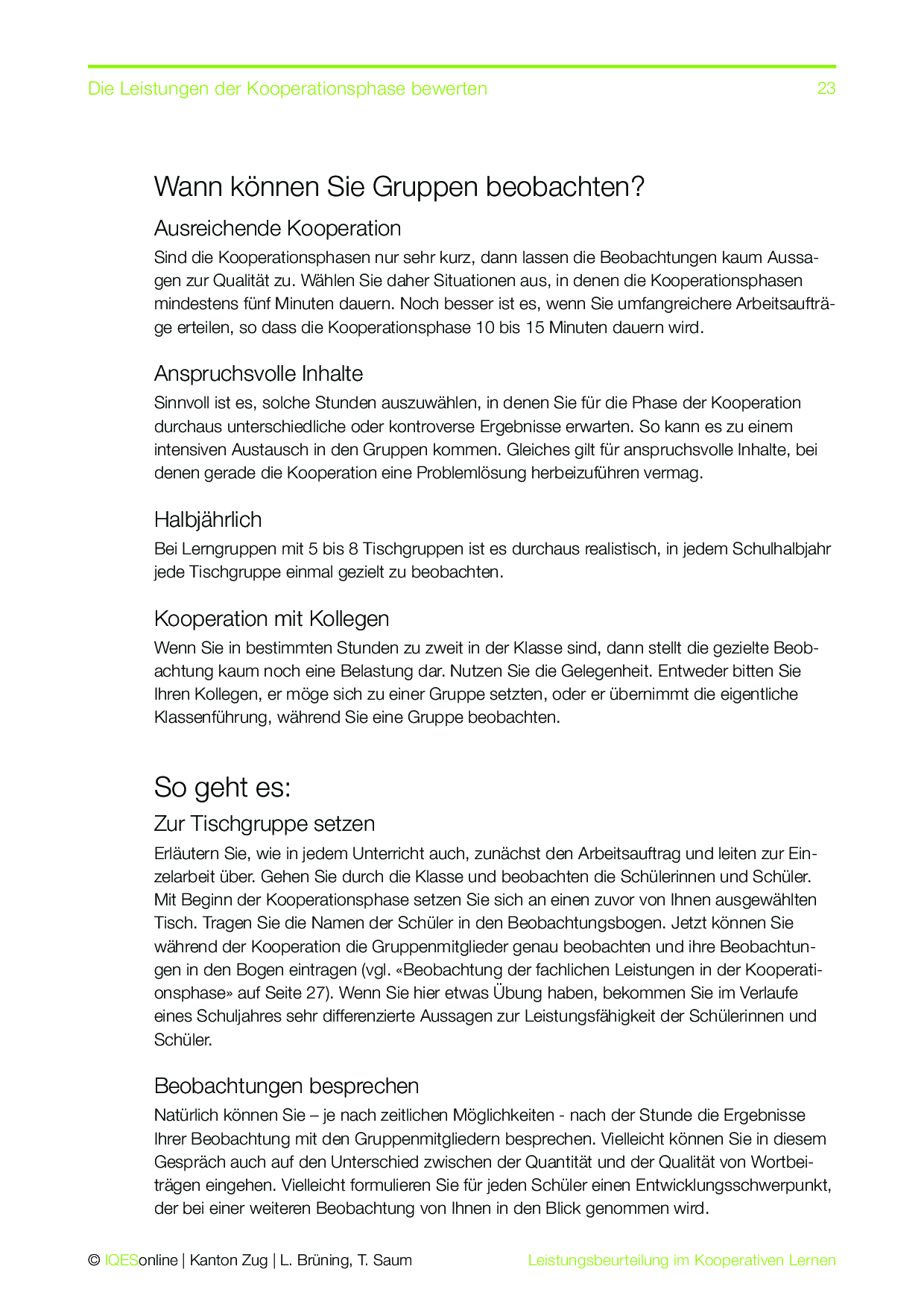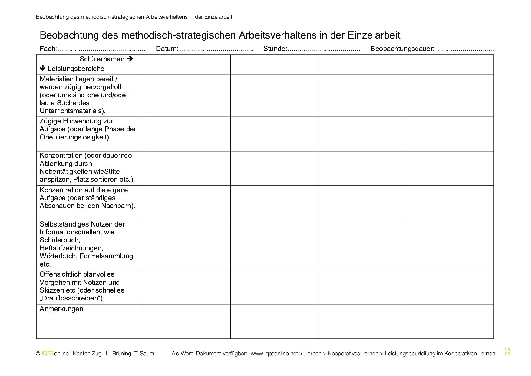Der Beobachtungsbogen kann von Lehrpersonen für das Festhalten fachlicher Leistungen in der Kooperationsphase nutzen. Schülerinnen und Schüler werden nach ihrem Handeln während des Kooperativen Lernens beurteilt.