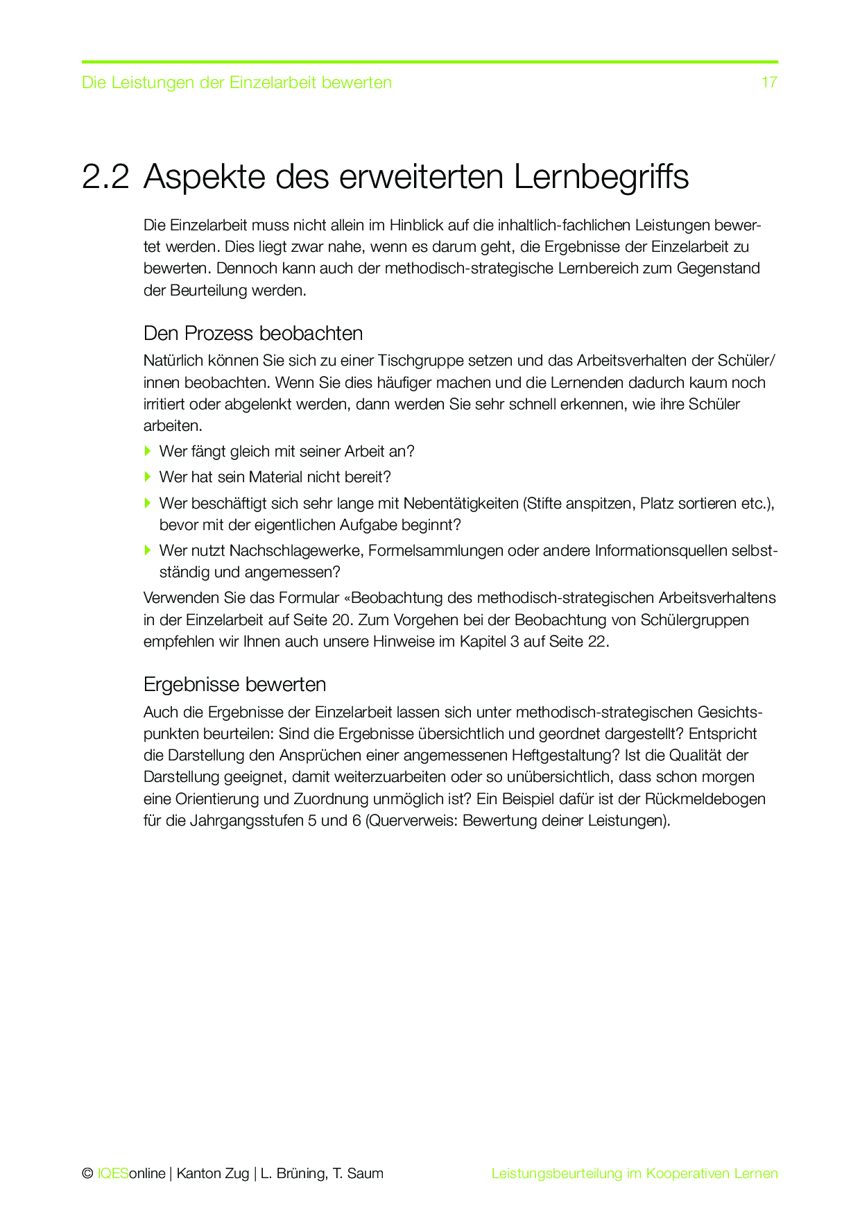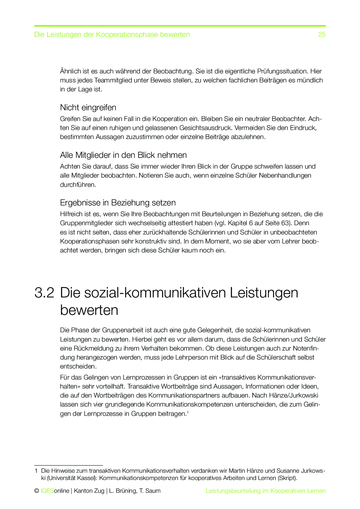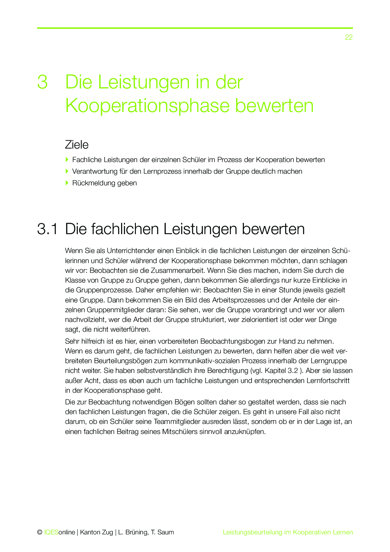 Der Beobachtungsbogen kann von Lehrpersonen für das Festhalten fachlicher Leistungen in der Kooperationsphase nutzen. Schülerinnen und Schüler werden nach ihrem Handeln während des Kooperativen Lernens beurteilt.