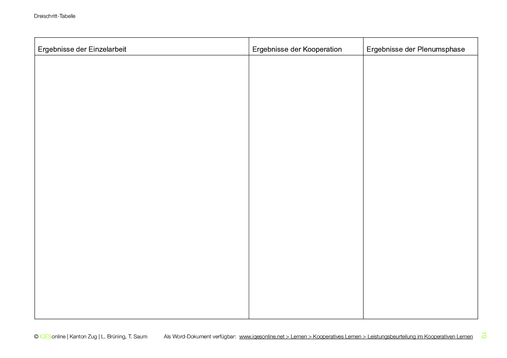 Mit dieser Dreischritt-Tabelle können die Schülerinnen und Schüler ihre Arbeitsergebnisse sowie -fortschritte festhalten. Diese Vorlage stammt aus dem Methodenkoffer «Leistungsbeurteilung im Kooperativen Lernen».
