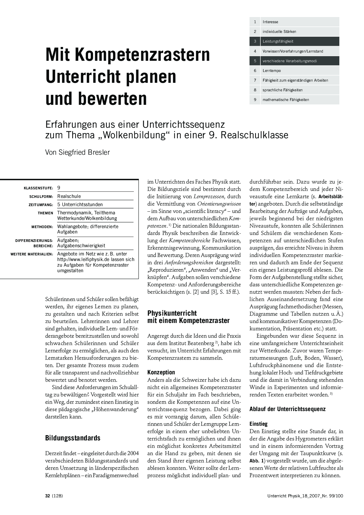 Erfahrungen zum Thema Kompetenzraster anhand einer Unterrichtssequenz zum Thema Wolkenbildung (im Fach Physik) in einer 9. Realschulklasse. Ziel war, in einem eher unbeliebten Fach möglichst gute Lernerfolge zu erzielen.