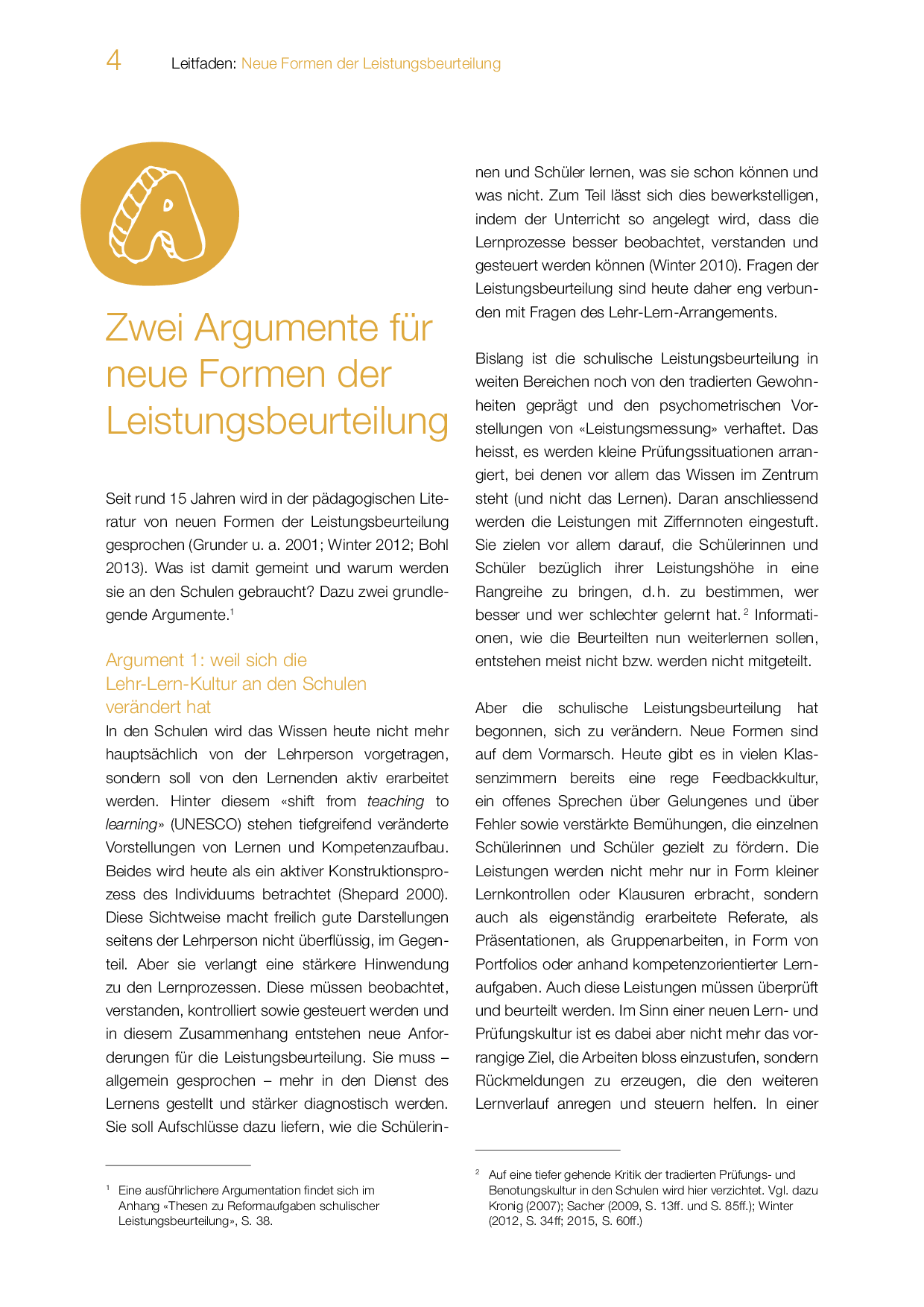Zeitgemäße Lehr- und Lernkulturen erfordern neue, veränderte und vielfältige Leistungsnachweise und -bewertungen. Aktives, handlungsorientiertes, schülerzentriertes, individuelles und kooperatives Lernen verlangt nach erweiterten Beurteilungsformen und -anlässen.