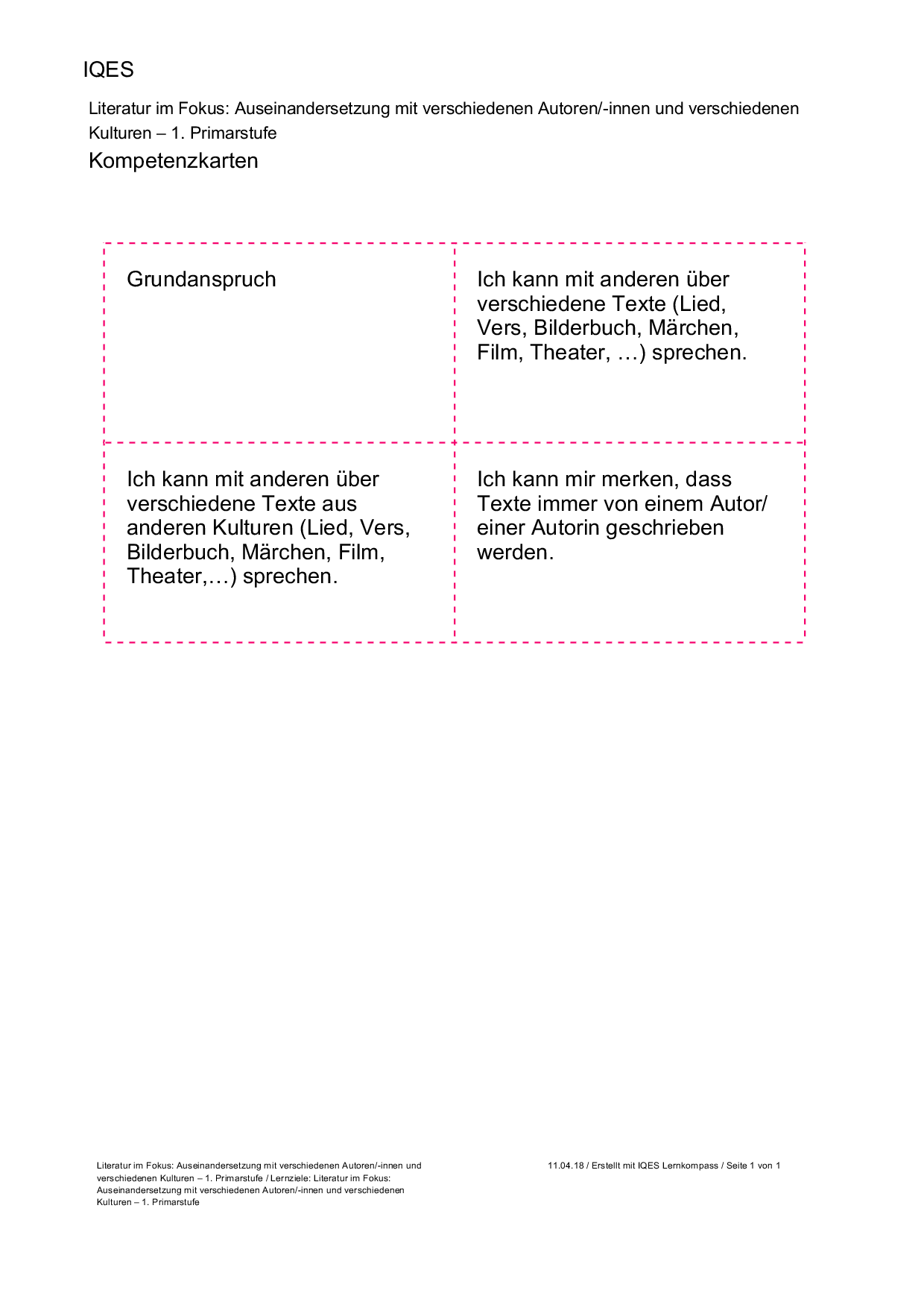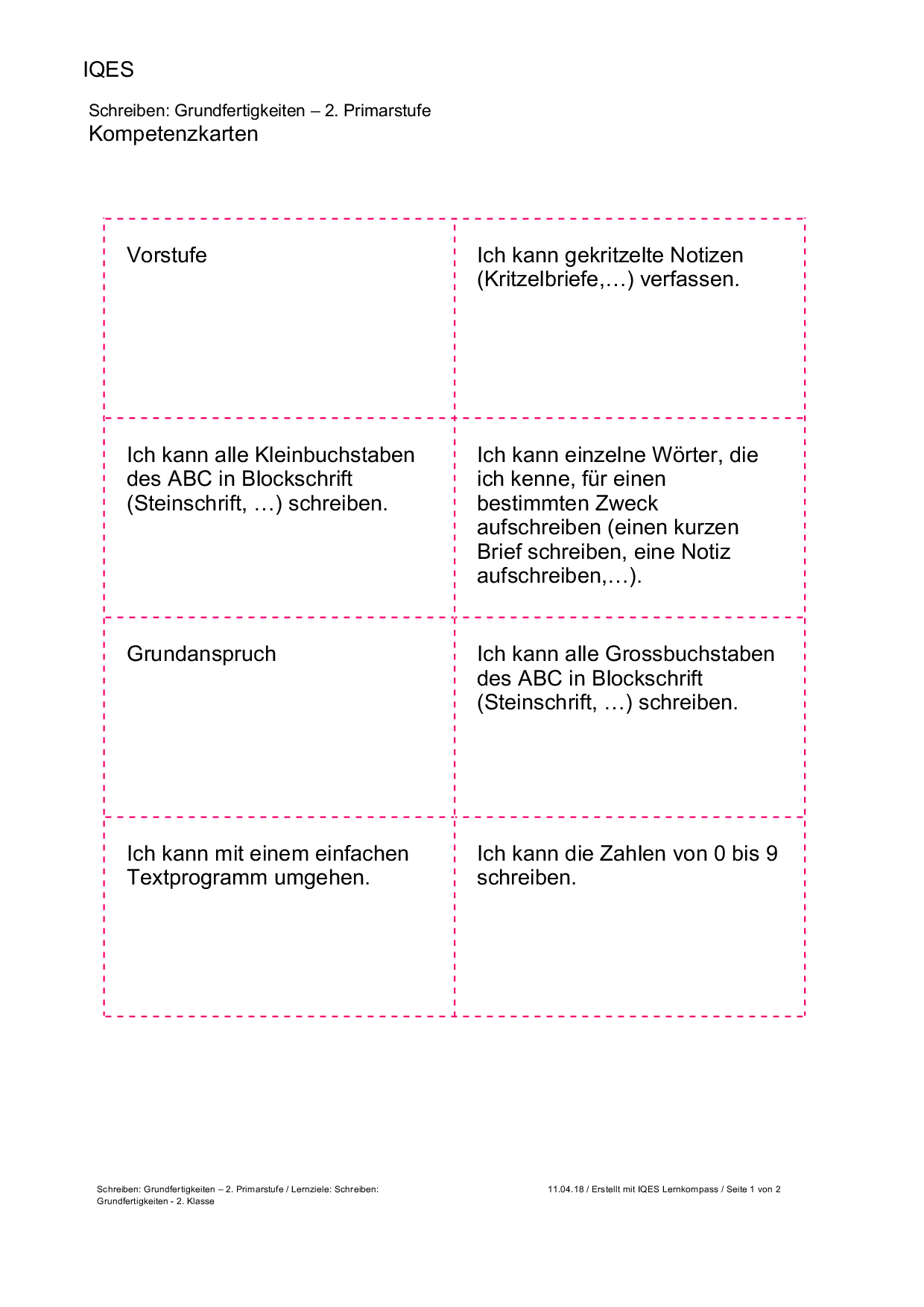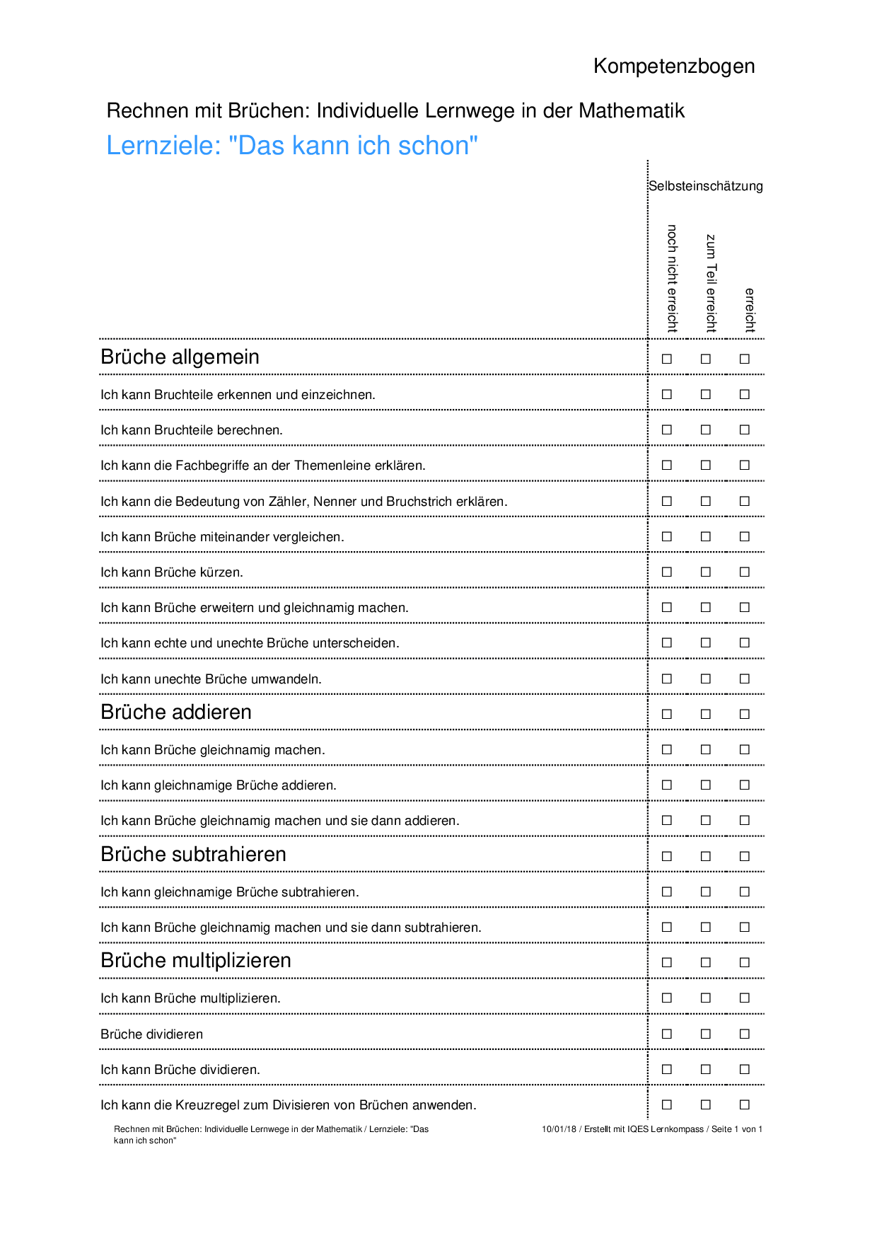 Kompetenzorientierte Lernziele mit Bezug auf Lehr- und Bildungspläne bieten Lernenden Orientierung vor- und während des Lernprozesses. Sie unterstützen die Lehrperson dabei, geeignete Wege, Instrumente und Strategien anzubieten, damit diese Ziele auch erreicht werden können und Kompetenzen sichtbar werden. Ich kann-Formulierungen helfen Kindern/Jugendlichen zu erkennen und zu überprüfen, über welche Teilkompetenzen sie schon verfügen und Klarheit darüber zu gewinnen, welche sie noch erwerben können und müssen. Kompetenzorientiert formuliert werden Ziele beobachtbar und damit auch überprüfbar.