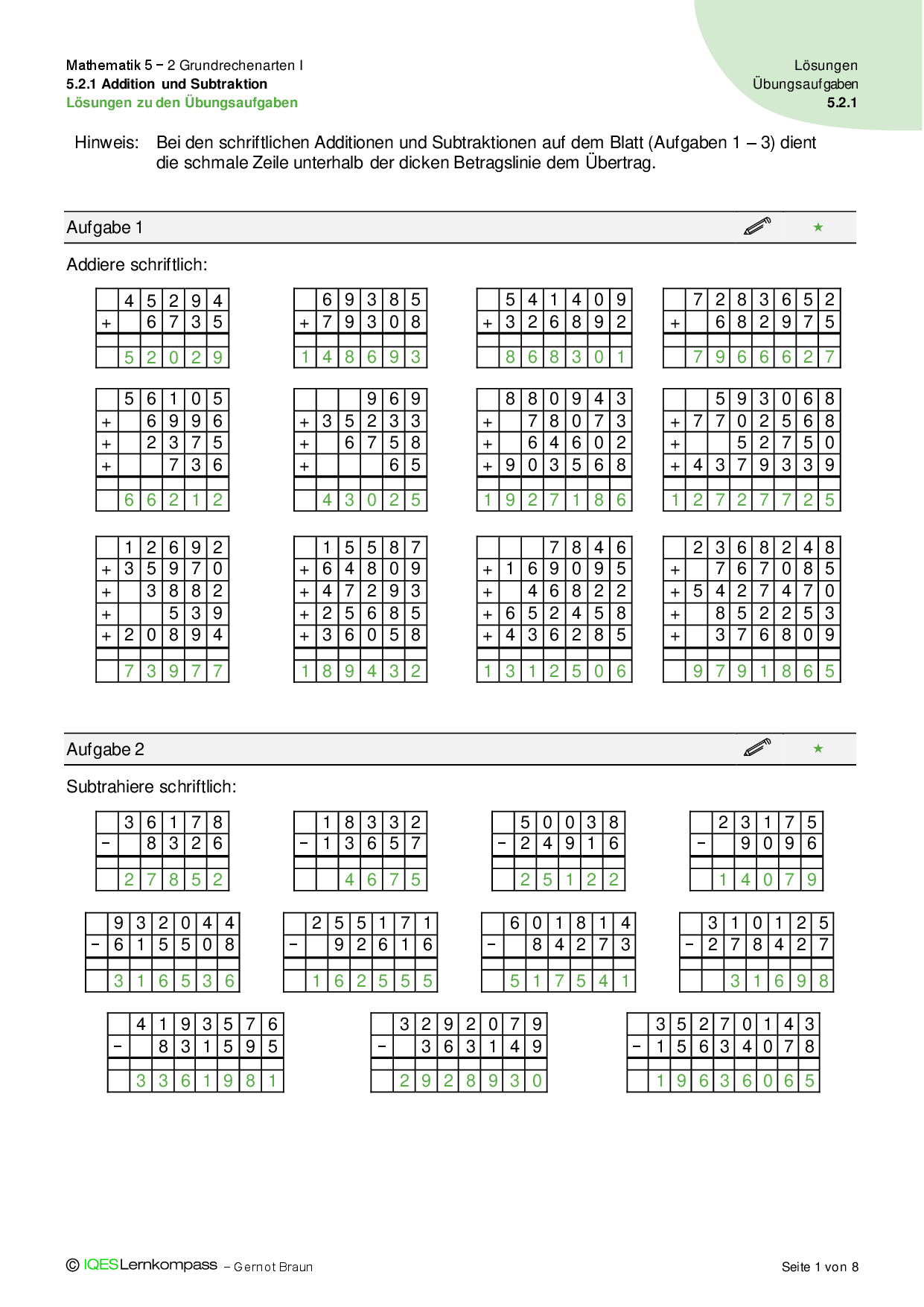 5.2.1 Addition und Subtraktion – Übungsaufgaben mit Lösungen