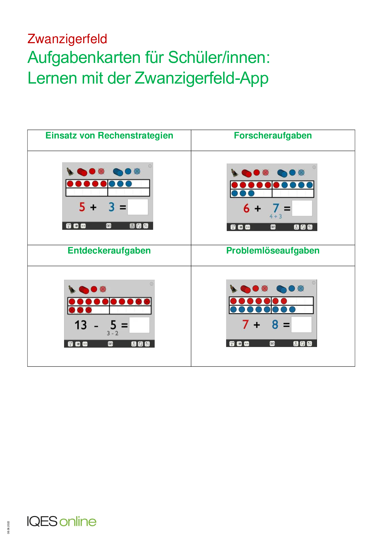 Aufgabenkarten für Schüler/innen: Lernen mit der Zwanzigerfeld-App