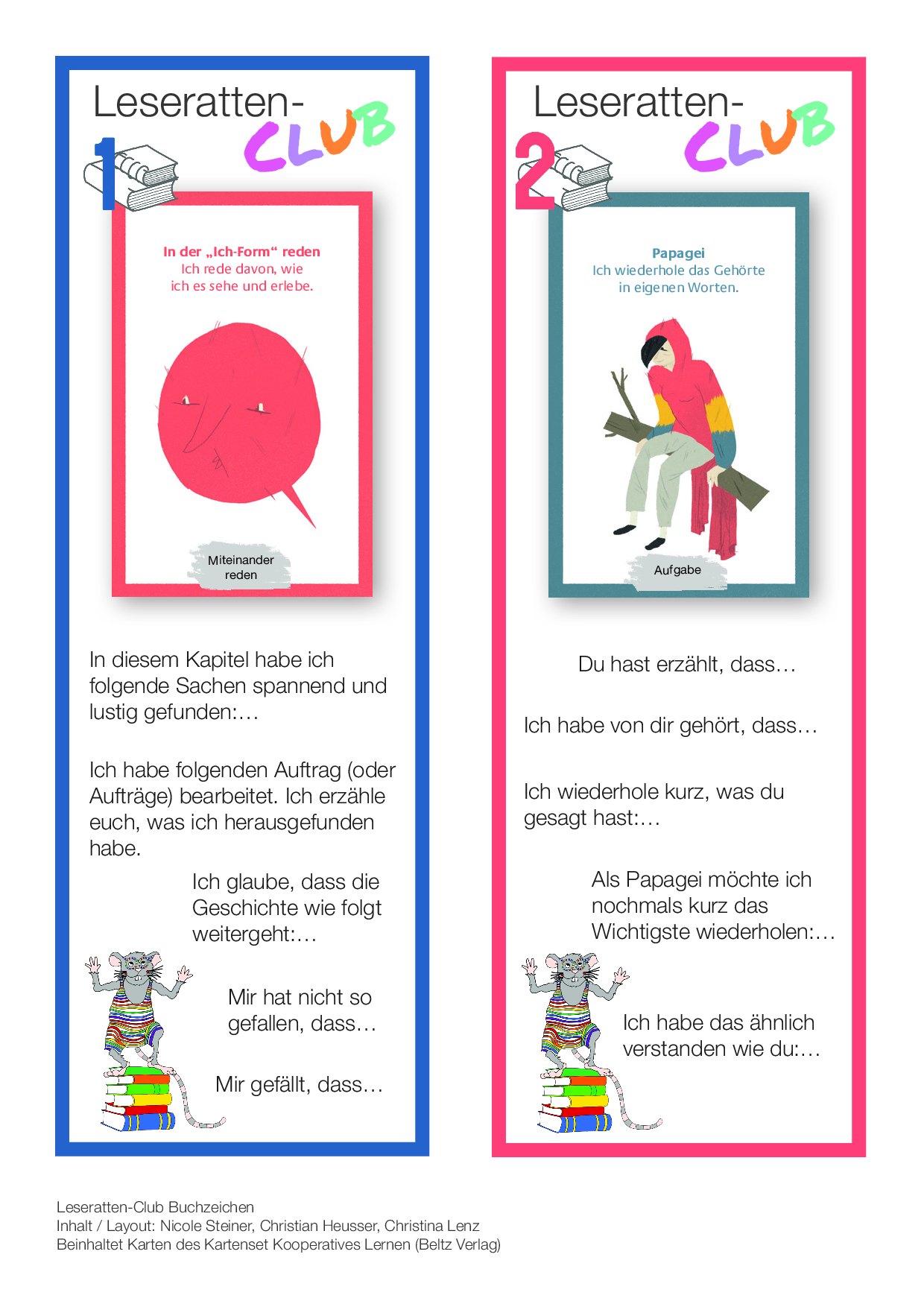 Die Rollenkarten des Leseratten-Club zum Ausdrucken. Der Austausch im Leseratten-Club wird durch vier Rollen(karten) des Kooperativen Lernens strukturiert: (1) Erzähler:in, (2) Papagei, (3) Nachfrager:in und (4) Feedbackgeber:in. Eine Beschreibung zum Leseratten-Club finden Sie im Leitfaden «Literatur entdecken mit Kindern» und auf den IQES-Seiten zum «Leseclub».