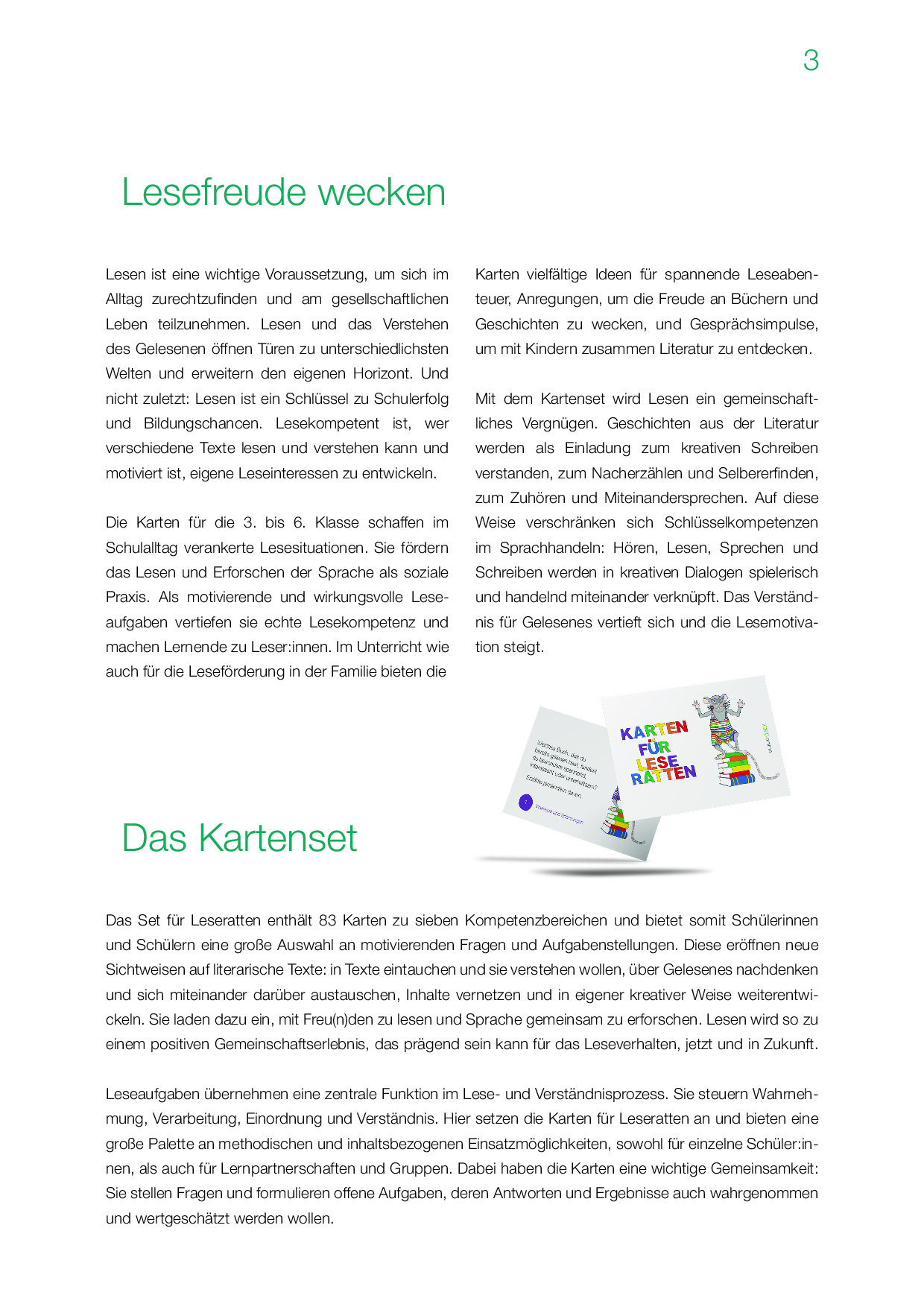 Das Kartenset für Leseratten ermöglicht den Schüler:innen durch eine große Auswahl an motivierenden Fragen und Aufgabenstellungen neue Sichtweisen auf gelesene Texte: in Texte eintauchen und sie verstehen wollen, über Gelesenes nachdenken und sich miteinander darüber austauschen, Inhalte vernetzen und in eigener, kreativer Weise weiterentwickeln. So entsteht Lesemotivation als Schlüssel zu nachhaltiger Lesekompetenz. Lernende gehen zunehmend eigenständiger, auch von ihren persönlichen Interessen geleitet, neugierig und motiviert an Texte heran, so dass diese in unterschiedlichsten Formaten fester Bestandteil ihres Alltags werden. Die Karten für Leseratten sind in sieben Kompetenzstufen/ Kompetenzbereiche gegliedert, die den Fokus auf verschiedene Verarbeitungsvariationen gelesener Texte legen. Sie verknüpfen zudem spielerisch die Schlüsselkompetenzen Lesen, Hören, Sprechen und Schreiben.