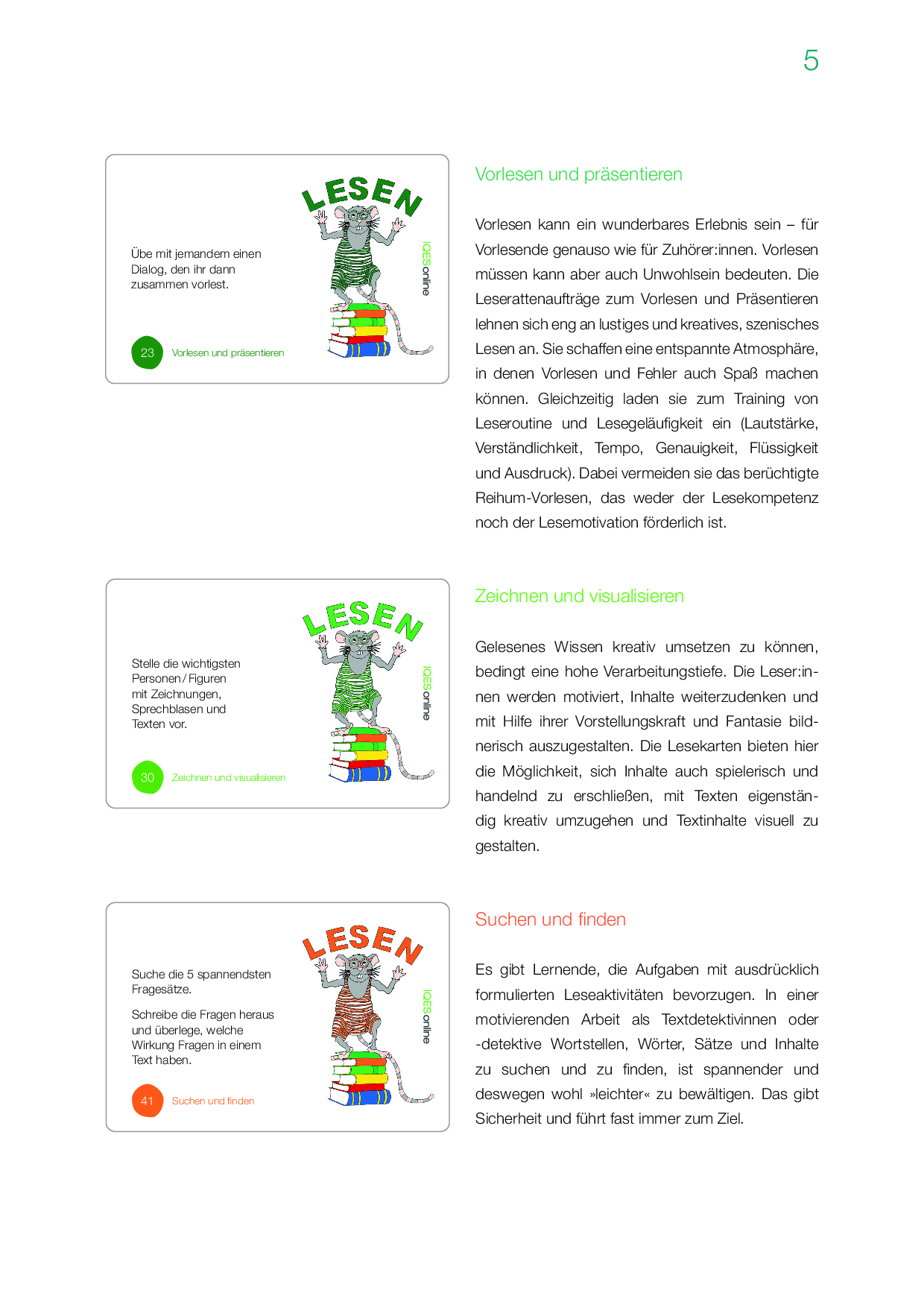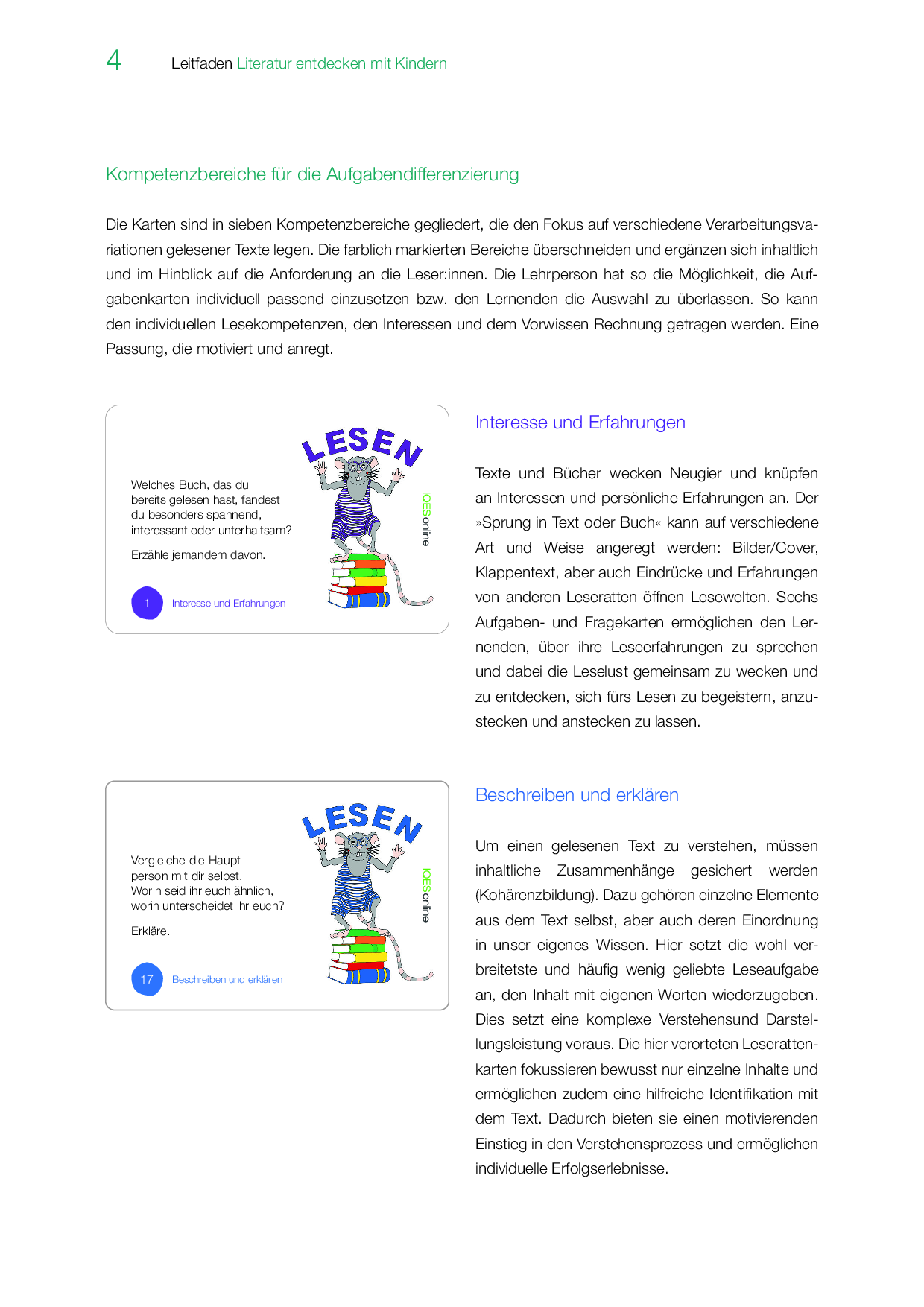 Der Leitfaden beschreibt, wie mit den Karten motivierende Lesezugänge in sieben Kompetenzbereichen eröffnet werden können. Er vermittelt Praxistipps für feste Lesezeiten und Leseclubs. Er zeigt, wie individuelles und kooperatives Lesen gefördert werden kann. Und er gibt Hinweise zur Bibliothek als Forschungsraum und zu Deep-Reading-Strategien für das Lesen auf digitalen Geräten.