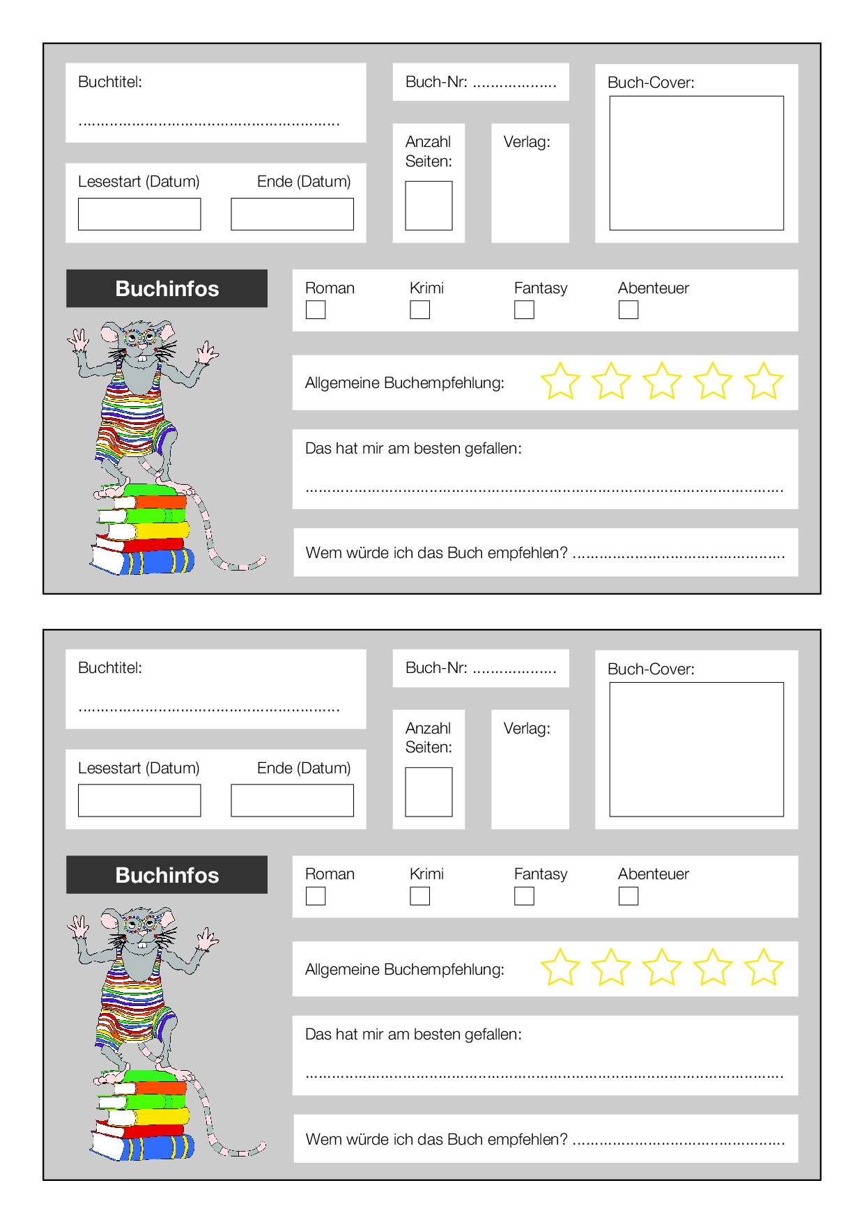 Ausgedruckt als selbstklebende Etiketten können die Leserattenkarten in Lesetagebüchern, Lesereiseführern oder in anderen Heften zum Einsatz kommen. Passend für die HERMA Etiketten 8716 (105x74mm).