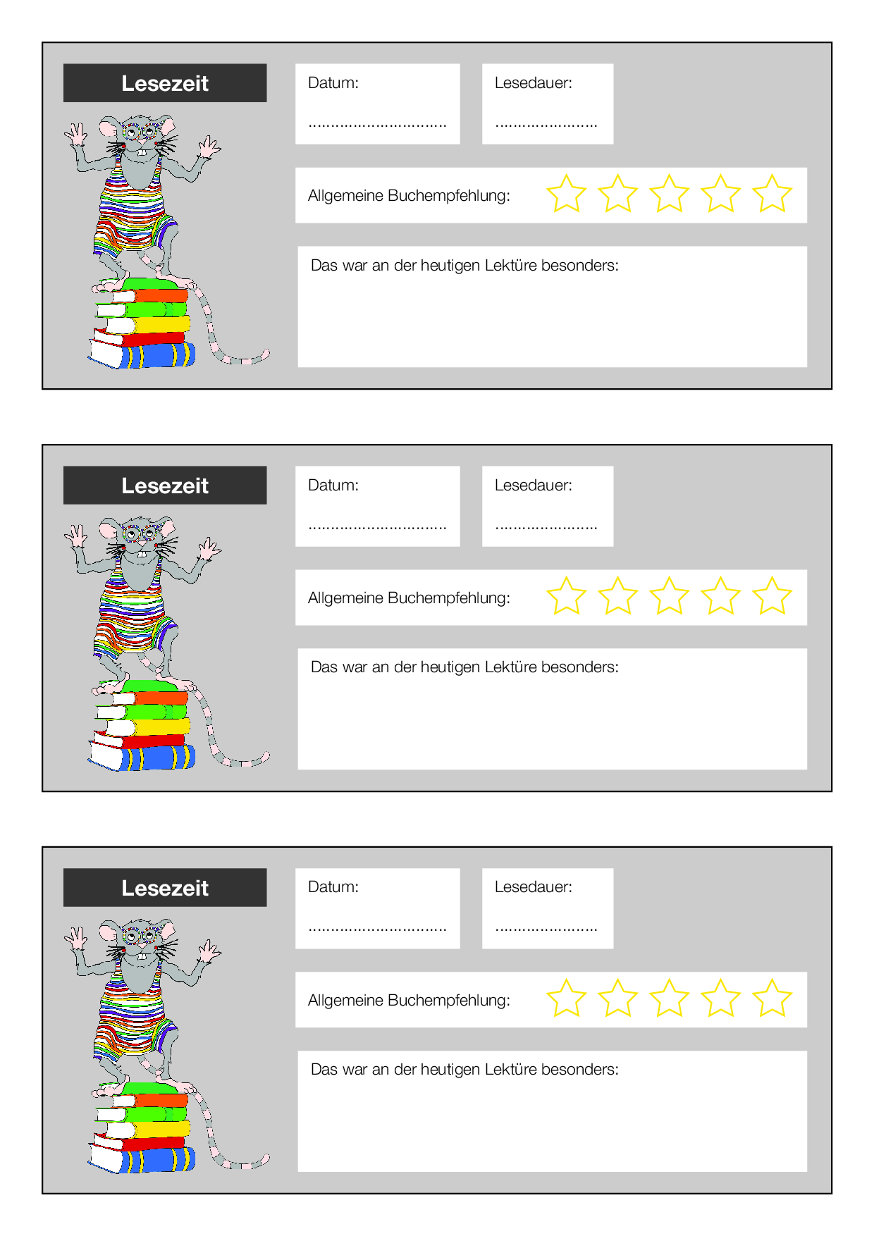 - Während einer ganzen Woche wird täglich eine frei gewählte Lektüre in einem vorgegebenen und individuell angepassten Zeitfenster gelesen. Als Abschluss kommt eine Leserattenkarte zum Zug.