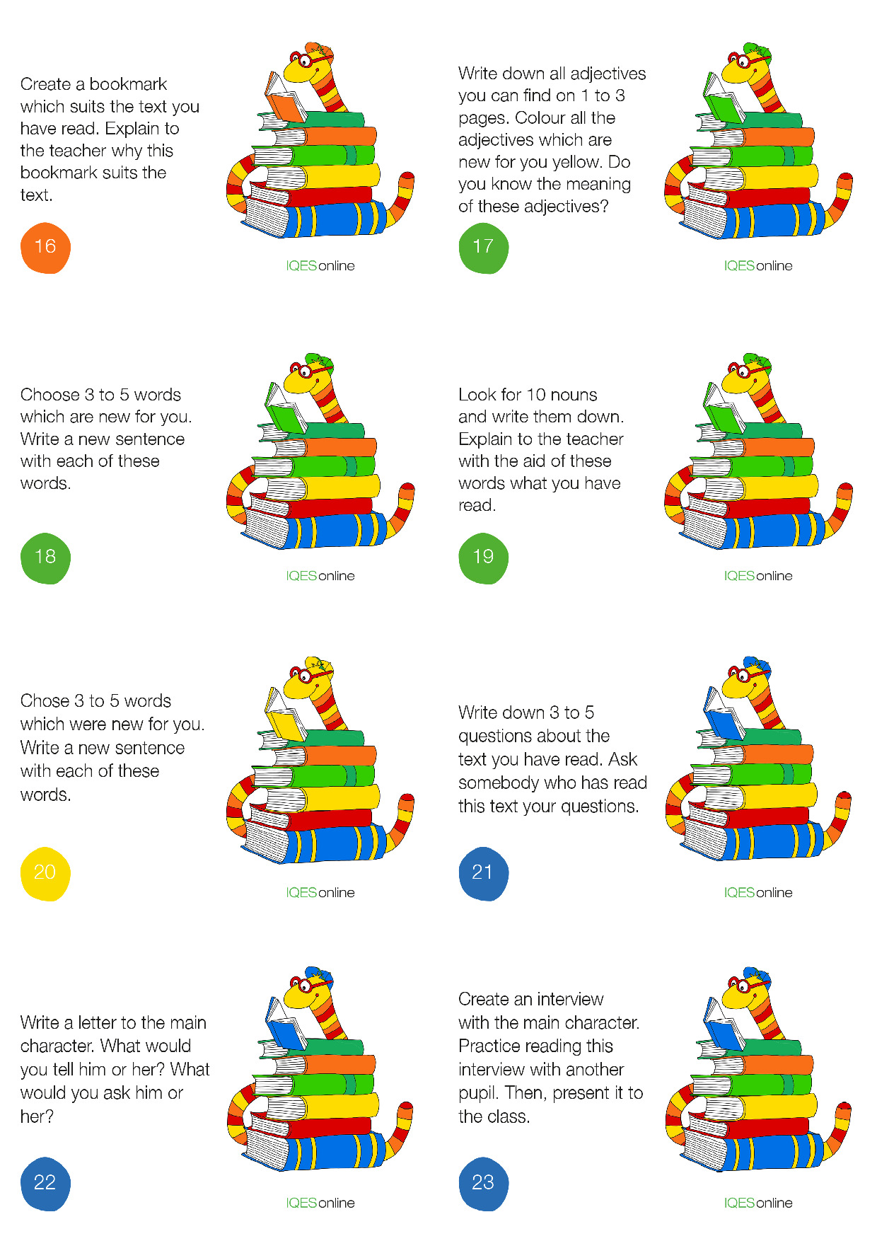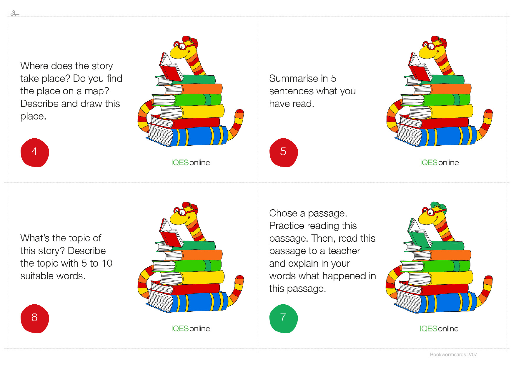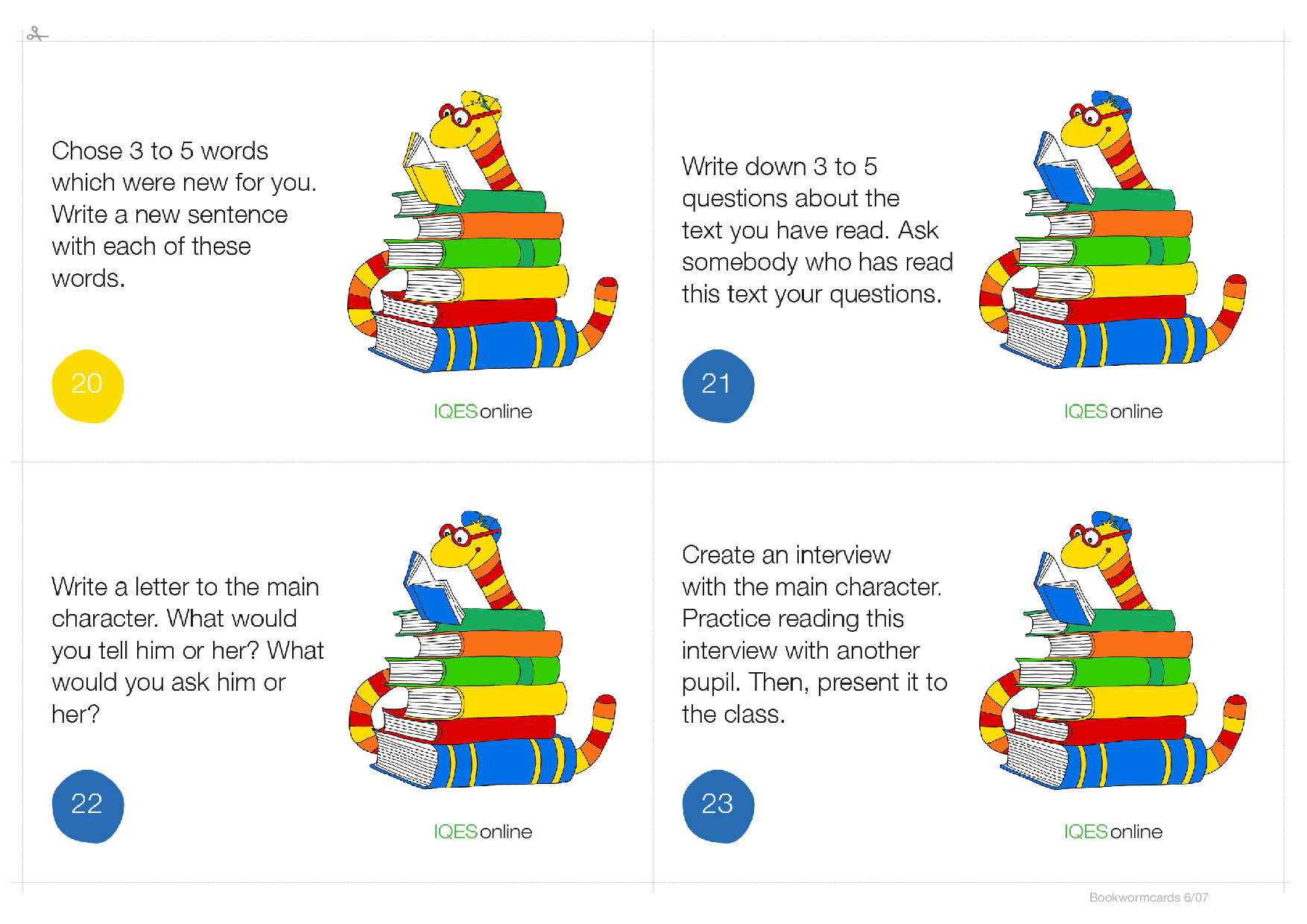 Hier setzen die Bookwormcards an. Durch eine große Auswahl an motivierenden Fragen und Aufgabenstellungen ermöglichen sie den Lesenden neue Sichtweisen auf gelesene und/ oder gehörte Texte: in Texte eintauchen und sie verstehen wollen, über Gelesenes nachdenken und sich miteinander darüber austauschen, Inhalte vernetzen und in eigener, kreativer Weise weiterentwickeln. So geht motivierender und vertiefender Spracherwerb, der Spass macht!