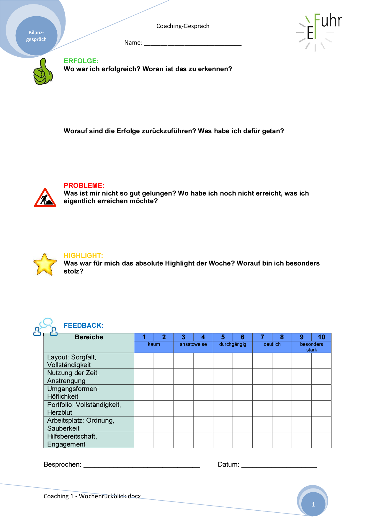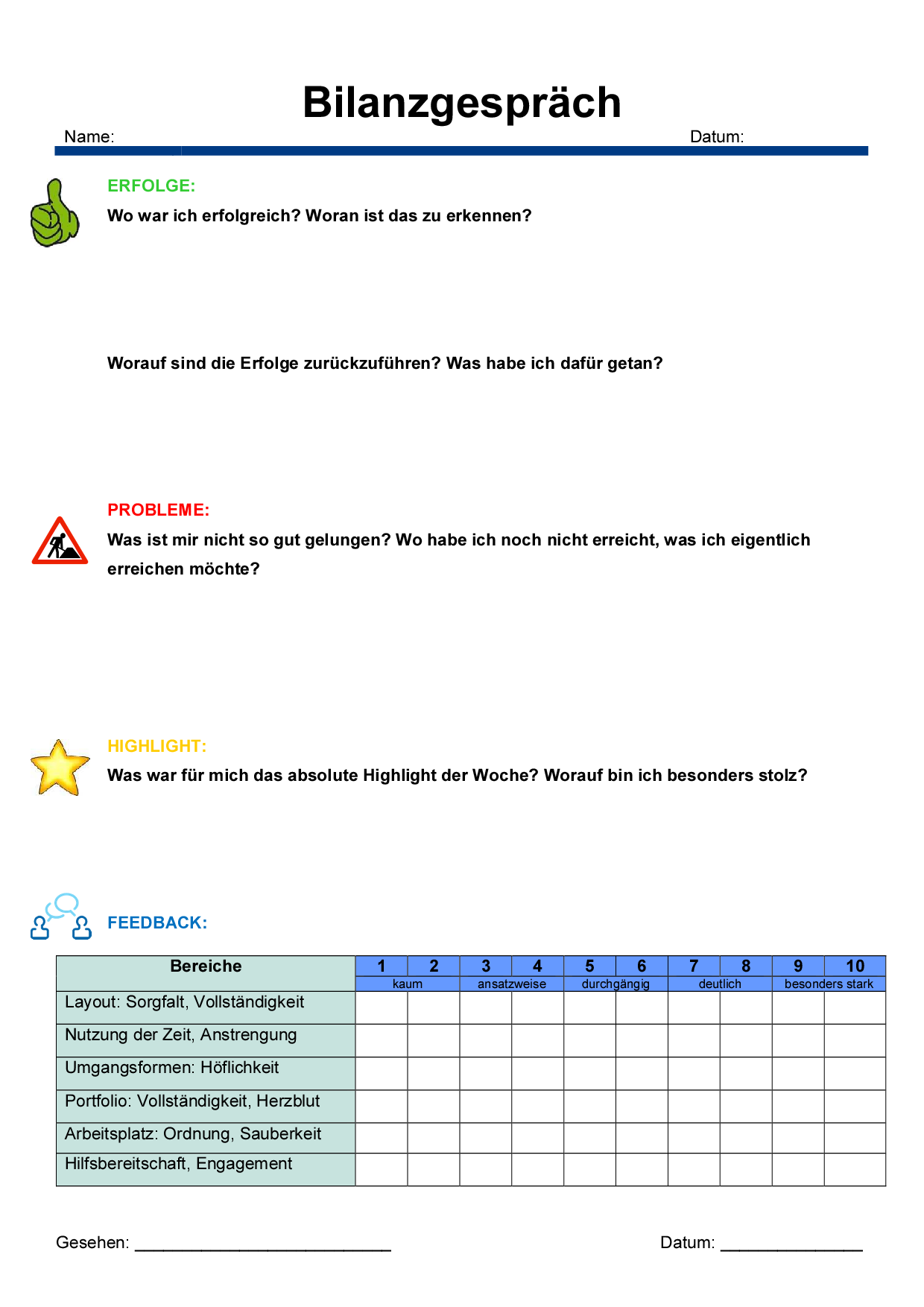 Dieses Dokument enthält drei Fragen zur Durchführung eines Bilanzgesprächers. Gemeinsam werden die Erfolge, Probleme und Highlights der Schülerin oder des Schülers besprochen.