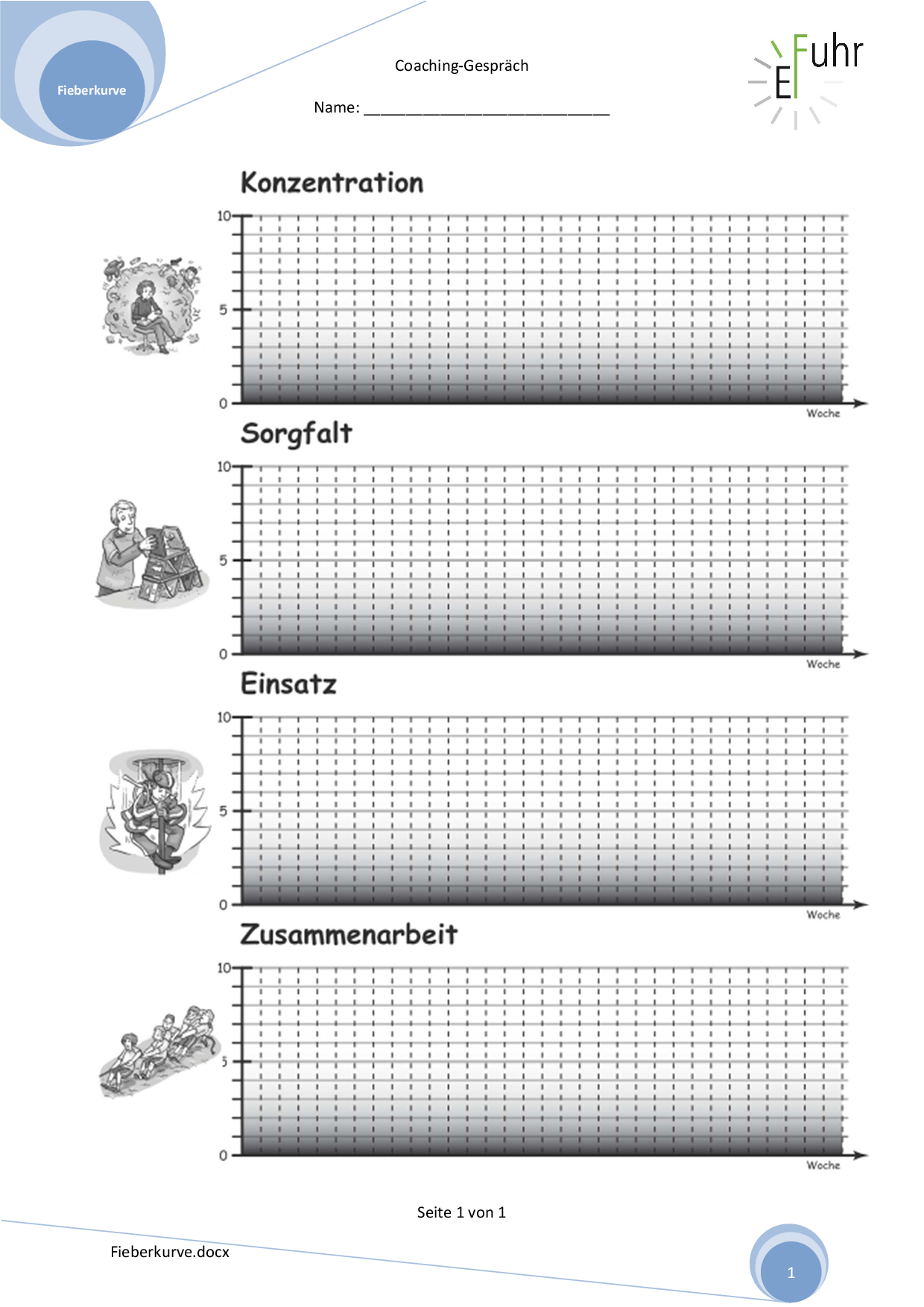 Mit der Fieberkurve aus der LiLO-Praxiskiste der OS Wädenswil können Coching-Gespräche gestaltet werden. Für jede Woche kann eine stellvertretende Zahl für Konzentration, Sorgfalt, Einsatz und Zusammenarbeit eingetragen werden. Damit kann eine Entwicklung sichtbar gemacht werden.