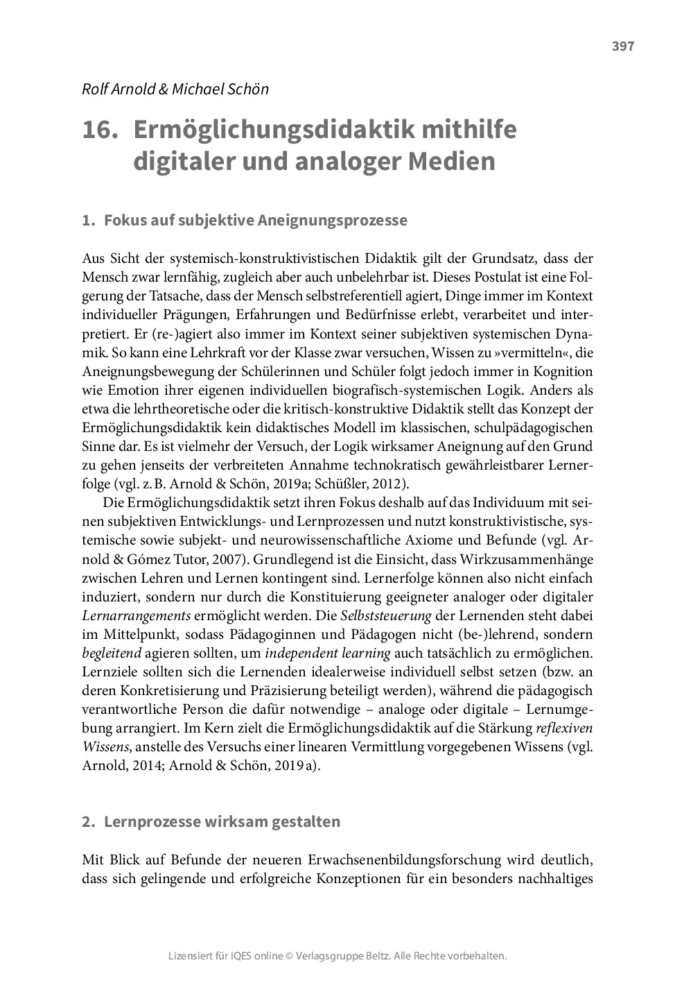 Aus Sicht der systemisch-konstruktivistischen Didaktik gilt der Grundsatz, dass der Mensch zwar lernfähig, zugleich aber auch unbelehrbar ist. Die Ermöglichungsdidaktik setzt ihren Fokus deshalb auf das Individuum mit seinen subjektiven Entwicklungs- und Lernprozessen. Die Selbststeuerung der Lernenden steht dabei im Mittelpunkt, sodass Pädagog*innen nicht (be-)lehrend, sondern begleitend agieren sollten, um selbstständiges Lernen auch tatsächlich zu ermöglichen. Rolf Arnold & Michael Schön beschreiben in ihrem Beitrag Gestaltungsprinzipien von Lernarrangements, die lebendiges und nachhaltiges Lernen fördern. Lehrpersonen, die sich als Lernbegleiter*innen verstehen, versuchen gezielt, die Selbstwirksamkeitsgefühle und das Selbstbewusstsein der Lernenden aktiv zu stärken. Ihre Aufgabe liegt primär darin, analoge wie auch digitale Lernräume so zu gestalten und arrangieren, dass diese bei den Lernenden SPASS wecken. Das Akronym SPASS steht dabei für die Kriterien selbstgesteuert, produktiv, aktivierend, situativ und sozial.