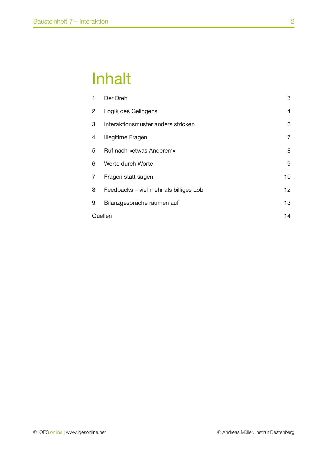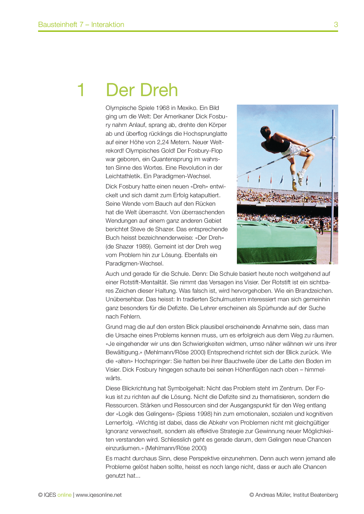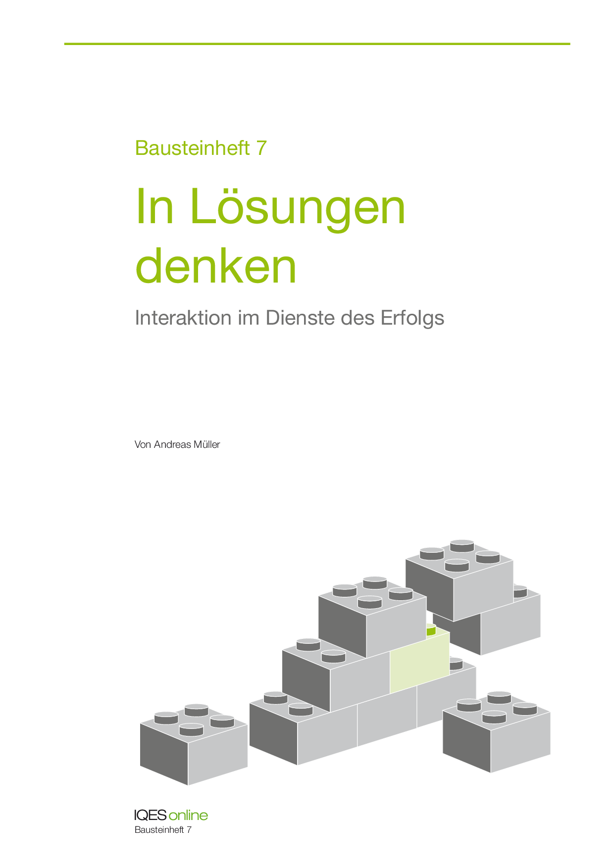 Das Bausteinheft 7 widmet sich der Frage nach Perspektiven und Lösungen. Es geht dabei darum, den Blick auf die Lösungen und nicht die Probleme zu richten und die Interaktion zum positiven nutzen.