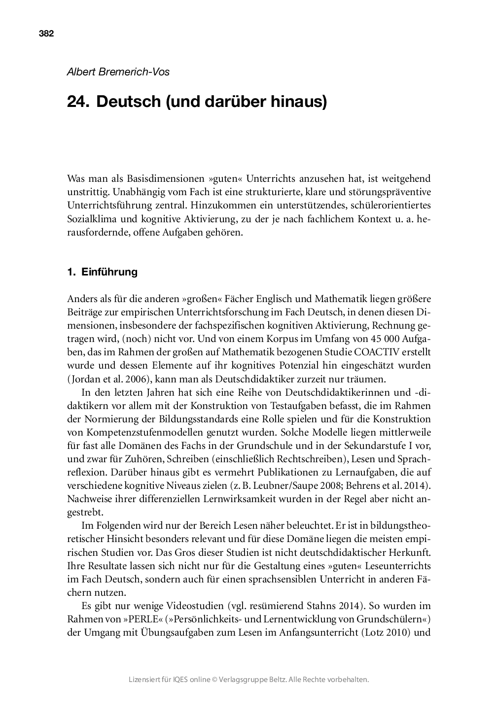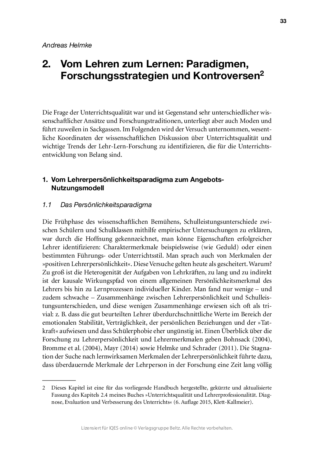 Die Frage der Unterrichtsqualität war und ist Gegenstand sehr unterschiedlicher wissenschaftlicher Ansätze und Forschungstraditionen, unterliegt aber auch Moden und führt zuweilen in Sackgassen. Im folgenden Bericht wird der Versuch unternommen, wesentliche Koordinaten der wissenschaftlichen Diskussion über Unterrichtsqualität und wichtige Trends der Lehr-Lern-Forschung zu identifizieren, die für die Unterrichtsentwicklung von Belang sind.