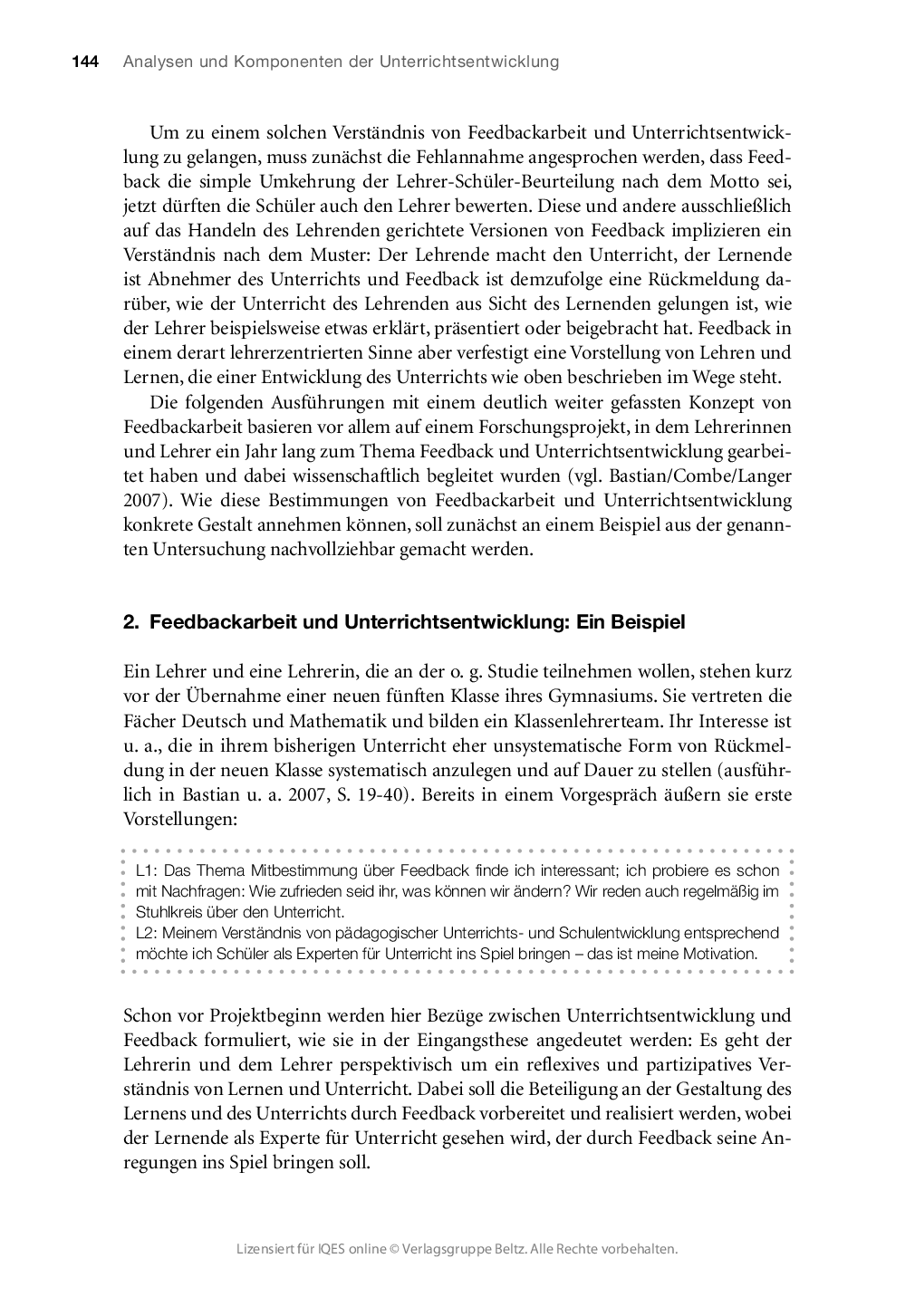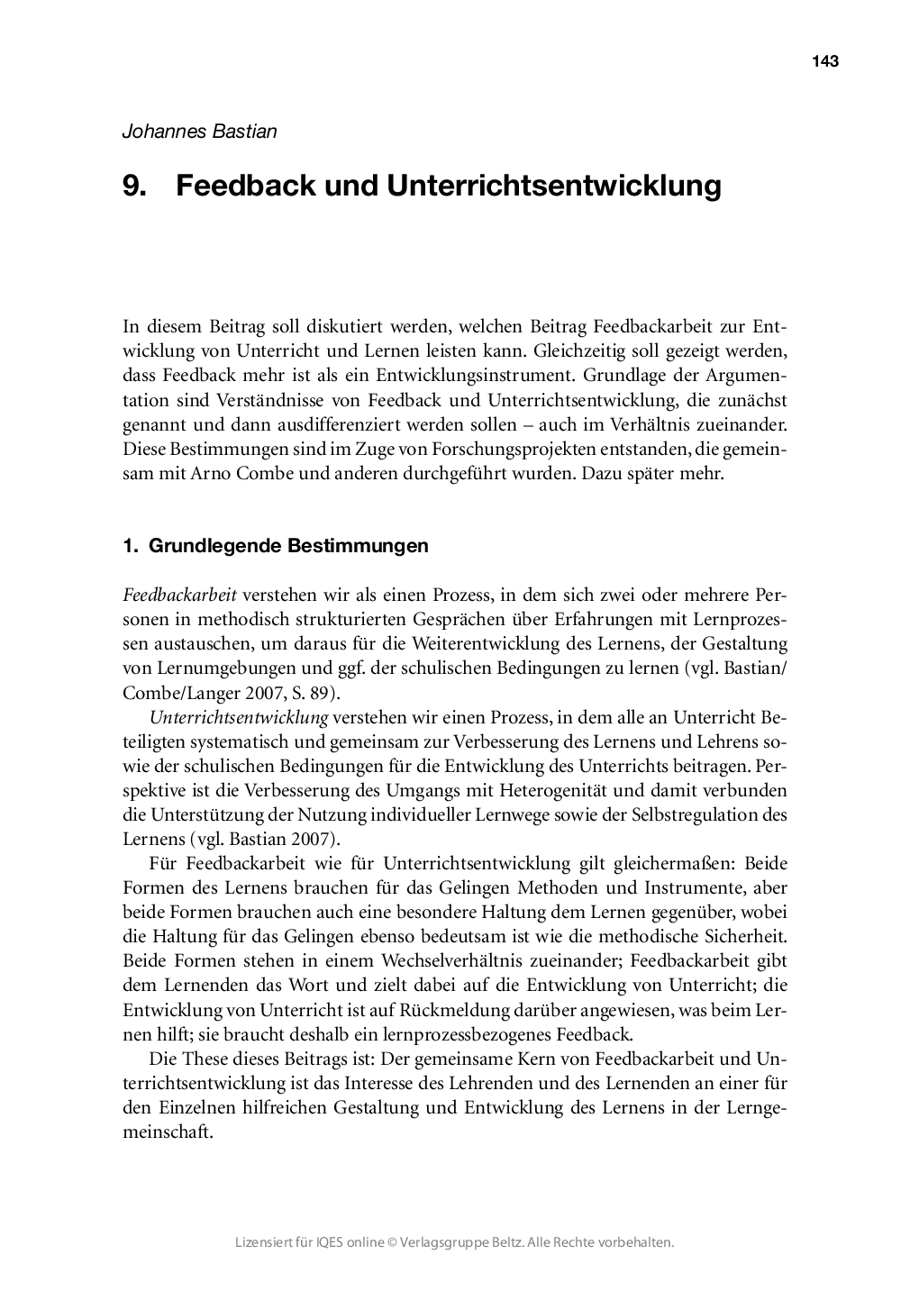 In diesem Beitrag soll diskutiert werden, welchen Beitrag Feedbackarbeit zur Entwicklung von Unterricht und Lernen leisten kann. Gleichzeitig soll gezeigt werden, dass Feedback mehr ist als ein Entwicklungsinstrument. Grundlage der Argumentation sind Verständnisse von Feedback und Unterrichtsentwicklung, die zunächst genannt und dann ausdifferenziert werden sollen – auch im Verhältnis zueinander. Diese Bestimmungen sind im Zuge von Forschungsprojekten entstanden, die gemeinsam mit Arno Combe und anderen durchgeführt wurden.